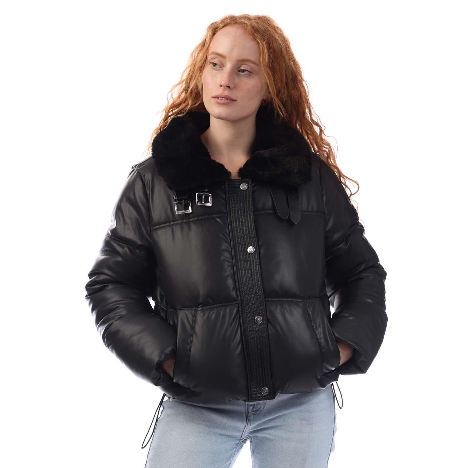 Womens DKNY Zip Front With Collar Puffer Jacket in black.