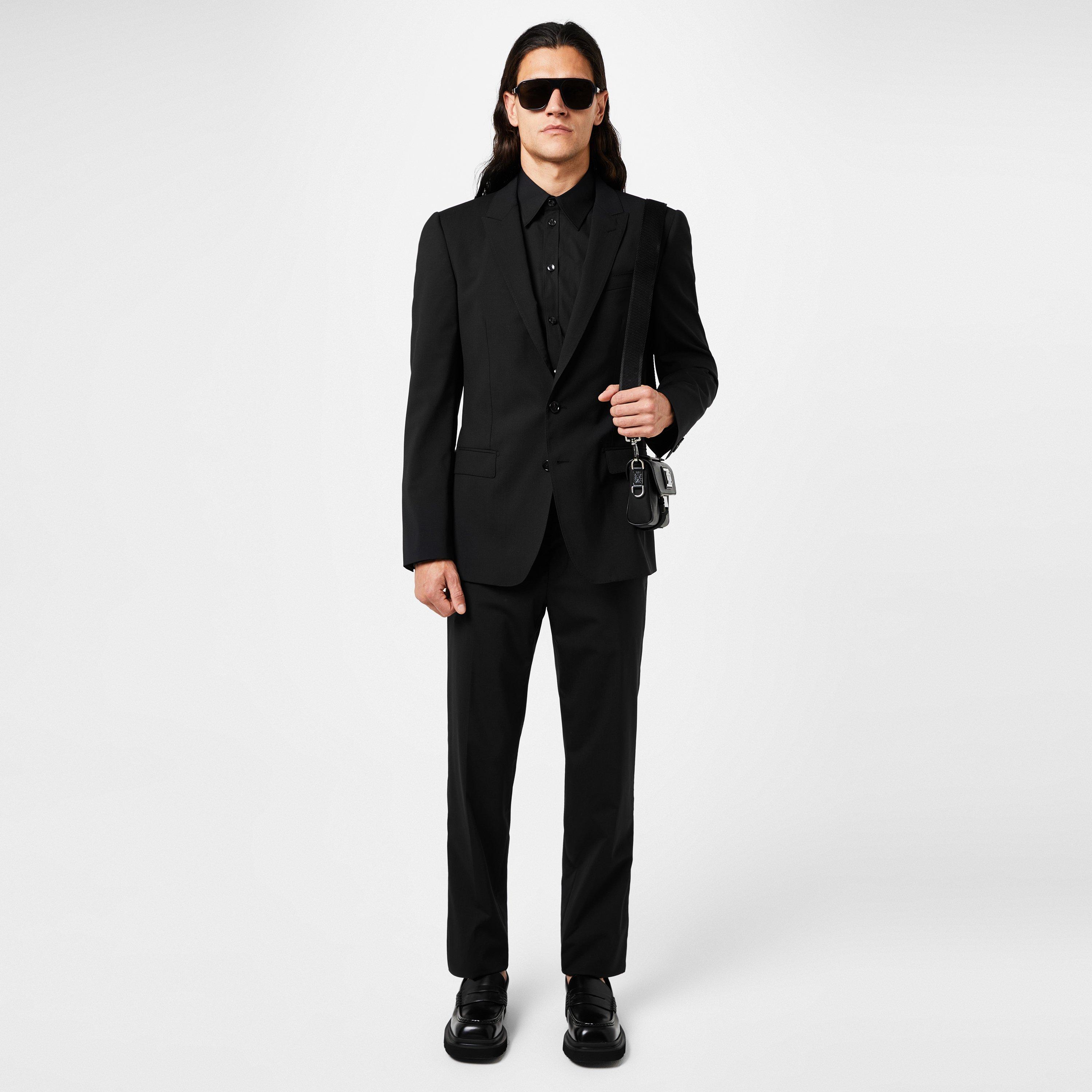 Add a finishing touch to your ensemble with this Formal Suit by Dolce and Gabbana. Cut with three front pockets, a notched lapel collar and a single rear vent, this suit then also features trousers with a zip fly, four pockets, belt loop holes and a metal clutch and buttoned waist closure. Meaning this suit would be a welcome addition to your refined menswear collection. Jacket and Trouser Fabric: 98% virgin wool, 2% elastane. Jacket and Trouser Lining: 85% silk, 15% rayon. Dry clean only.