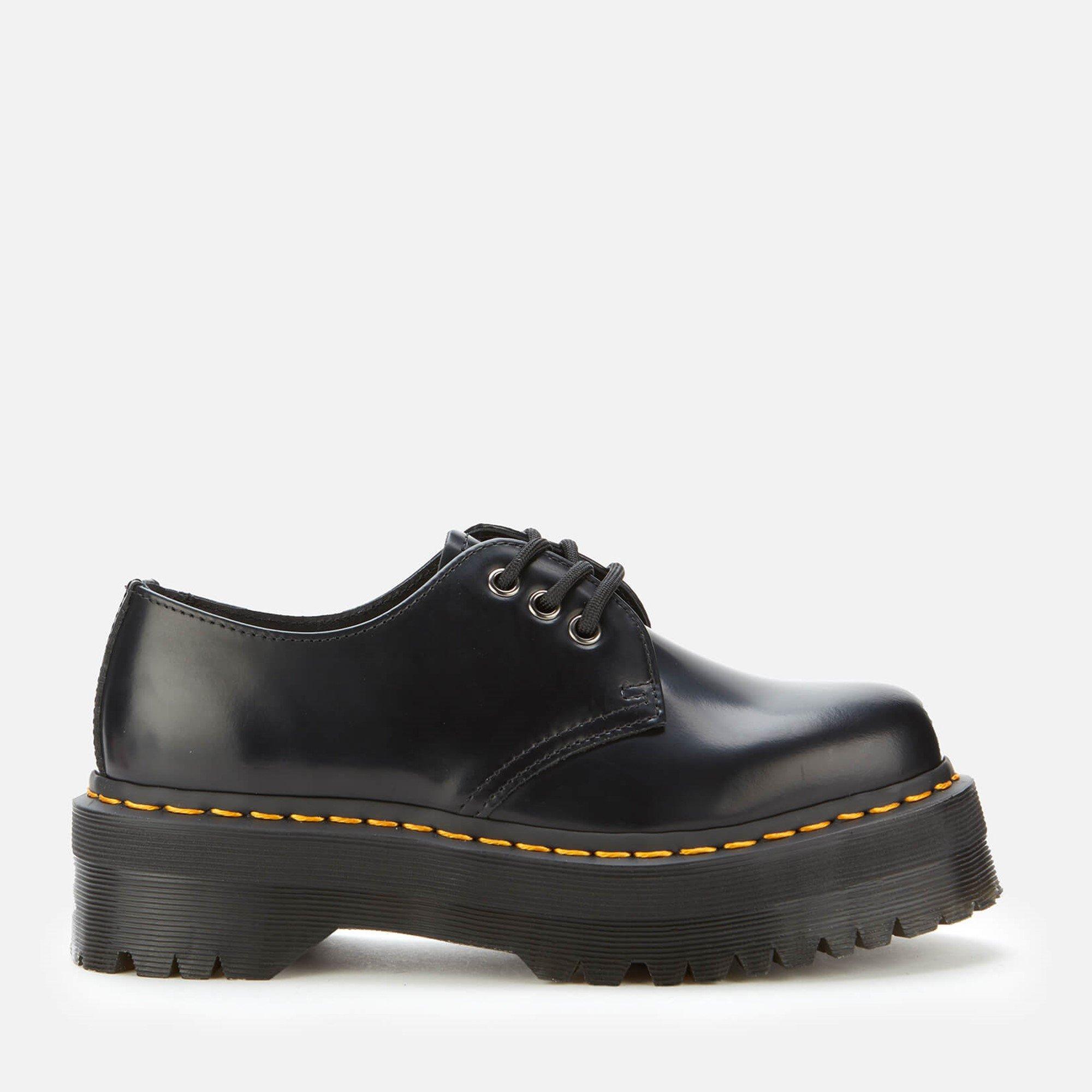 The Unisex Adults Quad Platform Leather Waterproof Derby Shoes from Dr Martens feature classic derby styling set on a substantial platform sole. Made from waterproof leather with traditional lace-up fastening, these shoes offer both durability and the brand's rebellious aesthetic.