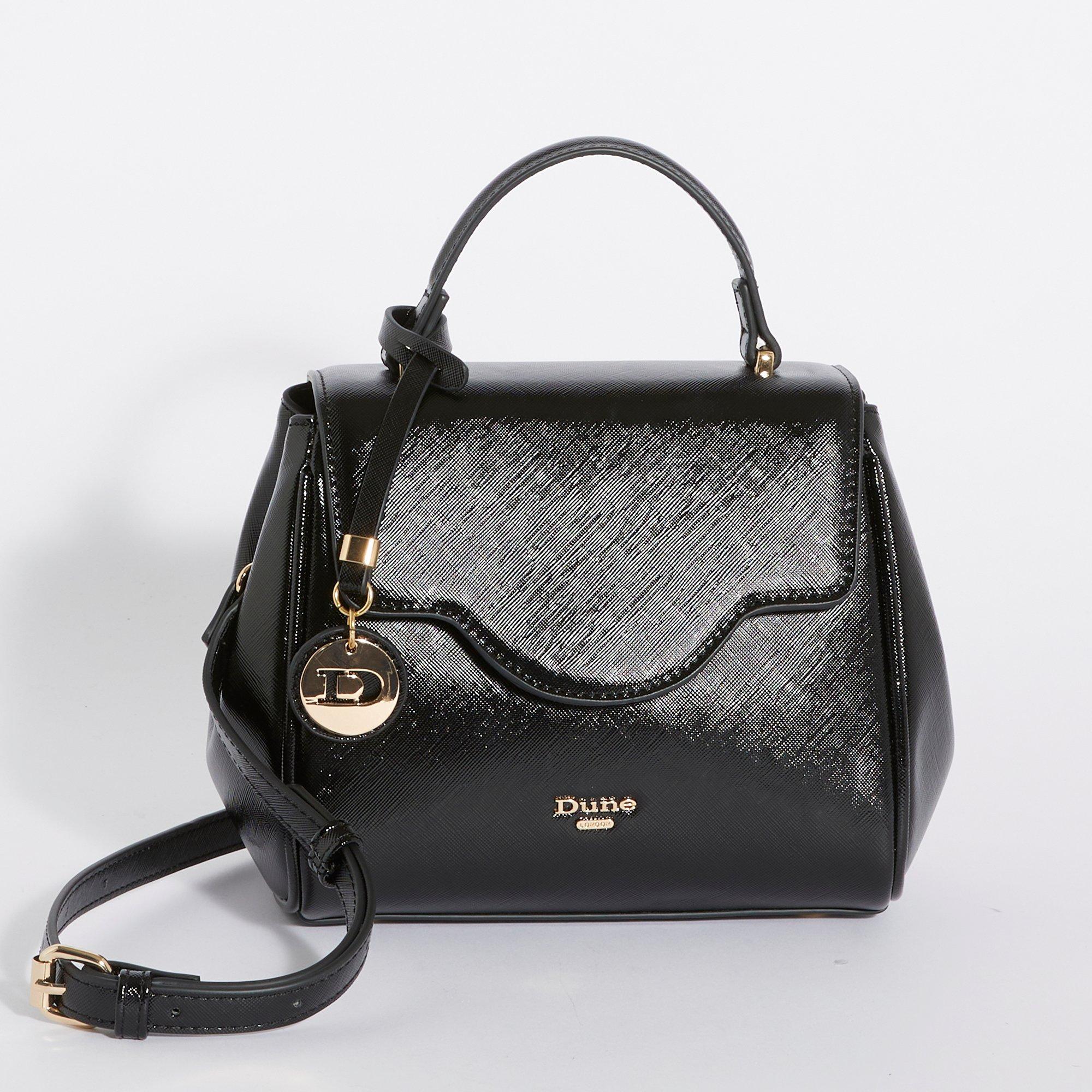 Dassio has been designed to take you through your working day in style. Crafted from patent with gold hardware this chic bag fastens with a mag dot closure and opens to reveal monogrammed lining two roomy compartments and handy side slip pocket. With our signature Dune London logo on the front this versatile bag comes with an additional cross body strap and a detachable gold logo charm that attaches to the top handle.