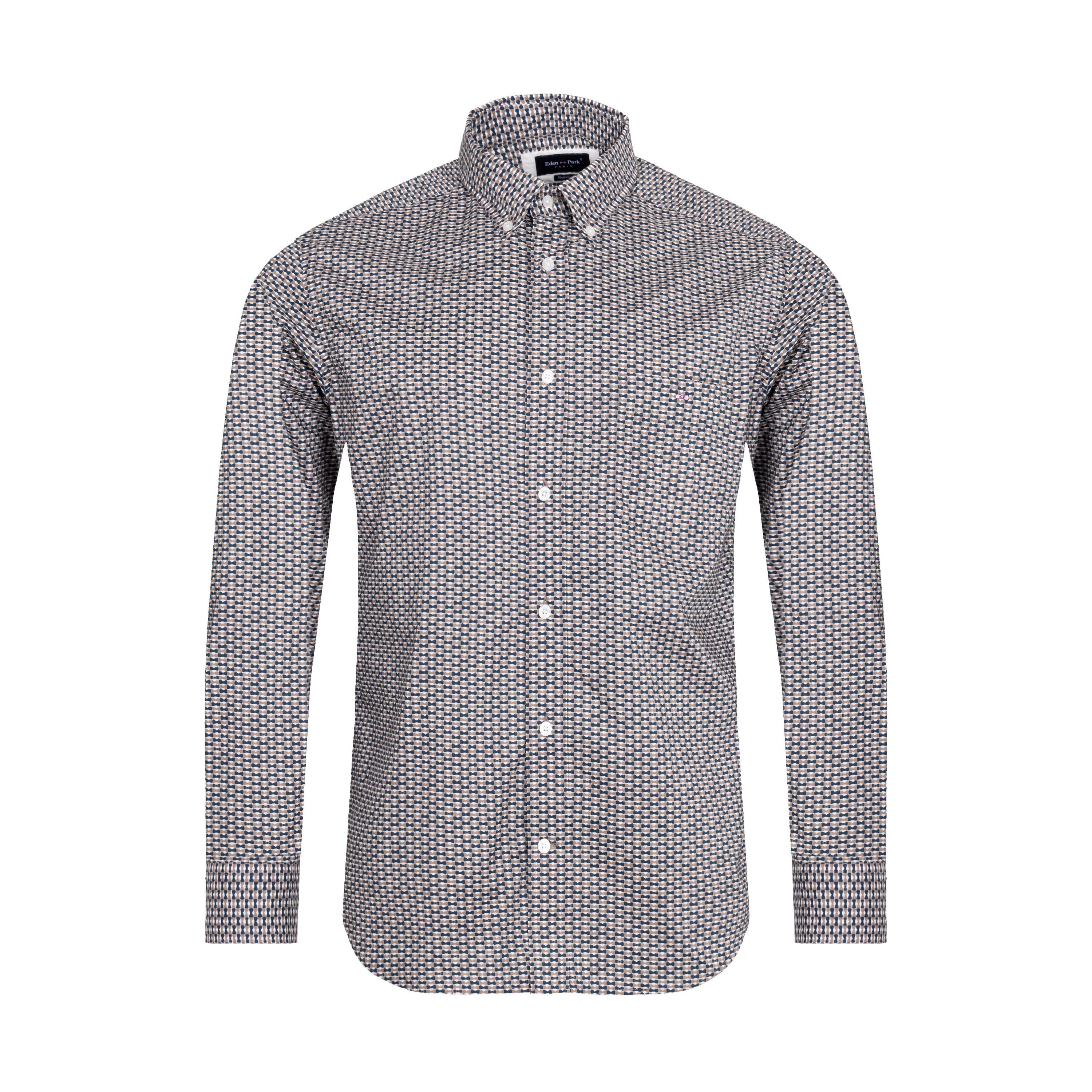 This fitted shirt features an exclusive, vintage-feel Eden Park geometric print, which conceals the iconic bow tie. The patch breast pocket also blends in subtly Cotton poplin Slim fit Italian fabric Exclusive Eden Park print Button-free shirt collar Oval signature buttons Patch breast pocket Embroidered bow tie logo at the hem Rounded hem.