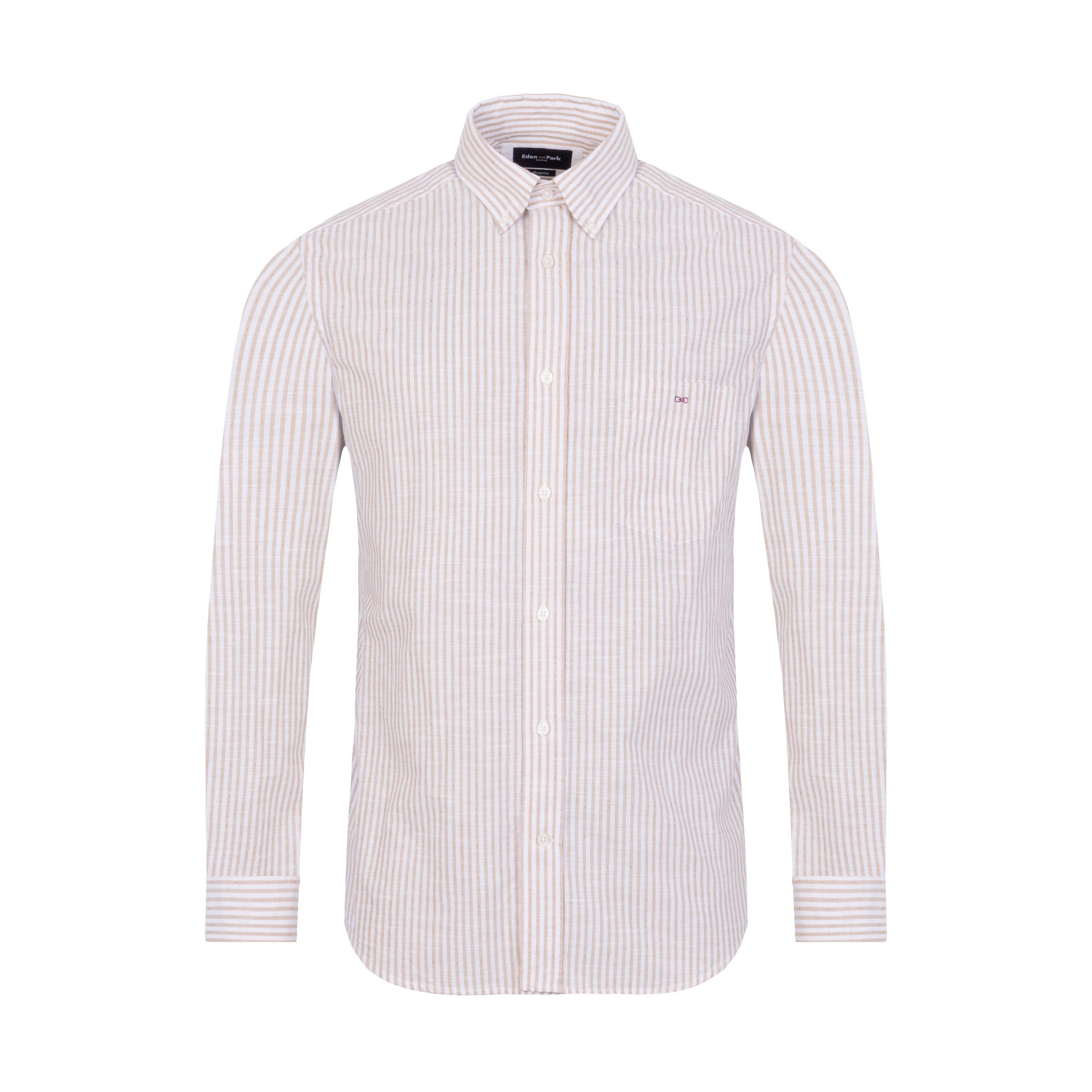 This striped yarntoyarn weave cotton shirt is adorned with a patch breast pocket with an embroidered bow tie logo and a buttoned shirt collar. Cotton. Regular fit. Fabric made in Italy. Buttoned shirt collar. Oval signature buttons. Patch breast pocket with embroidered bow tie logo. Back comfort pleats. Rounded hem.
