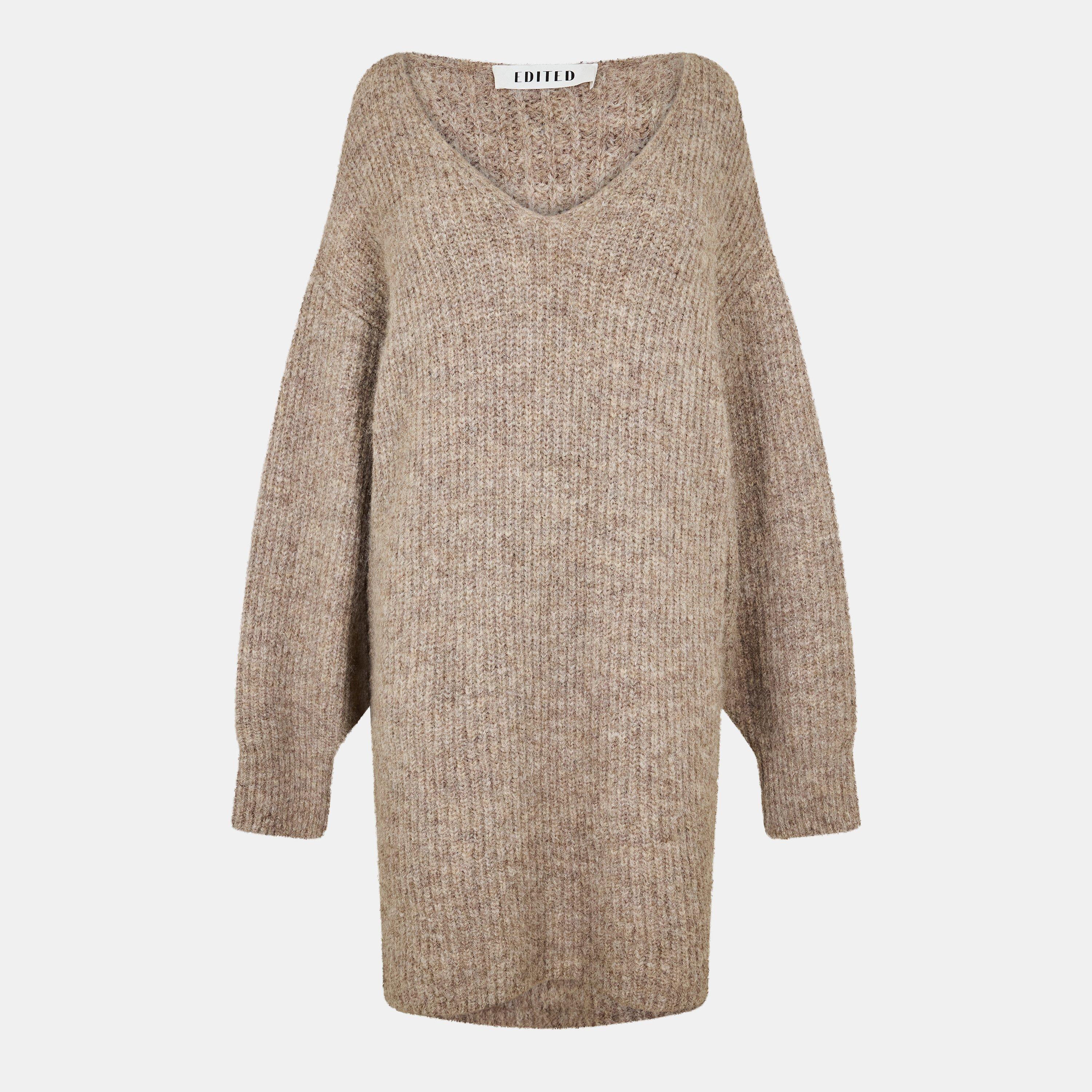 V-neck, rib knit sweater dress with a dropped shoulder.