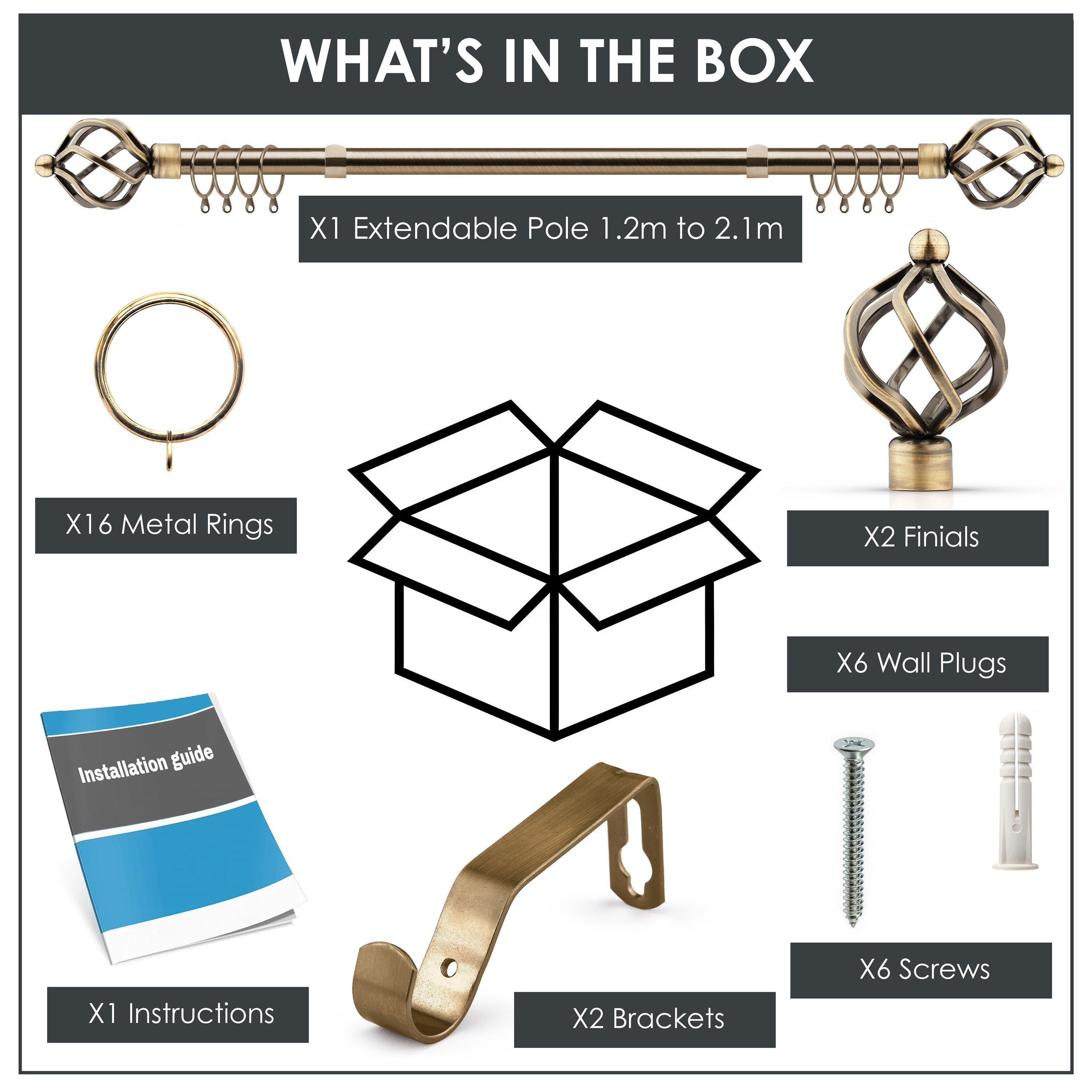 ADJUSTABLE: The extendable pole can be easily adjusted to fit your desired width DURABLE: Rust and corrosion proof finish on all components STRONG: This 16- diameter extendable metal pole is suitable for heavy fabrics, curtains and voiles EASY TO MOUNT: Our easy fit curtain pole is quick and simple to install at your window - full instructions included. CONTENTS: Curtain Pole, Finials, Curtain rings, Brackets, Fittings Pack, Fitting instructions (matching holdbacks also sold separately) Our poles come in an attractive range of finishes and designs, with matching holdbacks sold separately, should you want to complete your look. This pole is designed for any type of curtain (eyelet or pencil pleat) and includes optional curtain rings for the purpose of hanging pencil pleat curtains. Suitable to mount on any window type, bringing a sophisticated look to any room.
