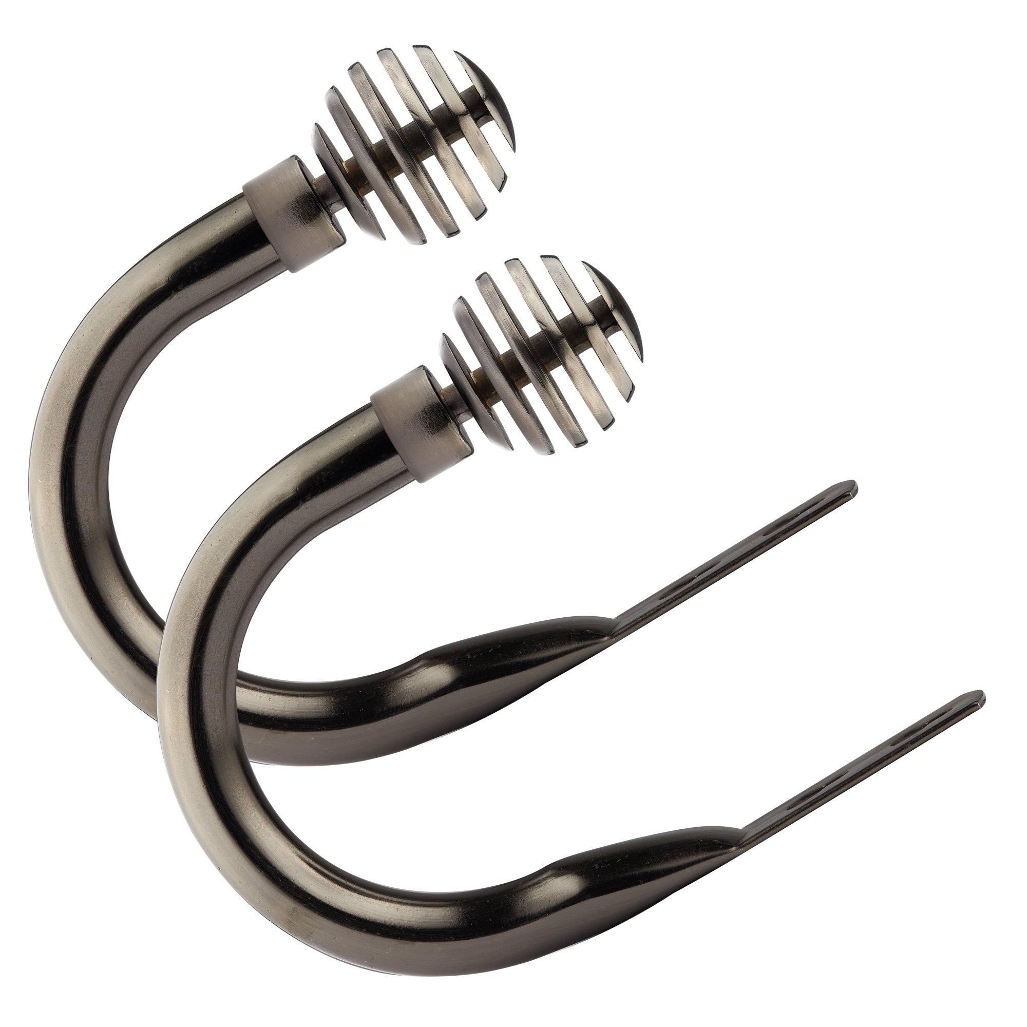 EASY TO MOUNT: Our easy fit tieback set is quick and simple to install at your window, full instructions included. DURABLE - Rust and corrosion proof finish on all components STRONG - This 19mm diameter metal holdback set is suitable for heavy fabrics, curtains and voiles COMPLETE YOUR LOOK - Matching curtain poles are available to complete your look. CONTENTS: 2 x Holdbacks, 2 x Finials, 1 x Fittings Pack, 1 x Fitting instructions These holdbacks will give you a more sophisticated finish when your curtains are drawn, letting you drape your curtain fabric in a more attractive way. Our holdbacks come in a broad range of finishes and designs, with matching poles sold separately, should you want to complete your look. This tieback is designed for any type of curtain (eyelet or pencil pleat) and includes all fixtures and fittings required to mount them. Suitable to mount on any window type, bringing a finishing touch to your windows.