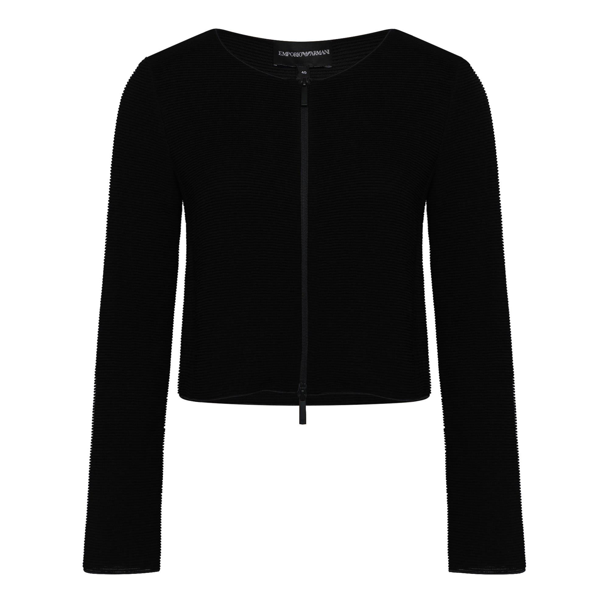 Round neck long sleeves cropped length and full zip closure. Textured fabric.