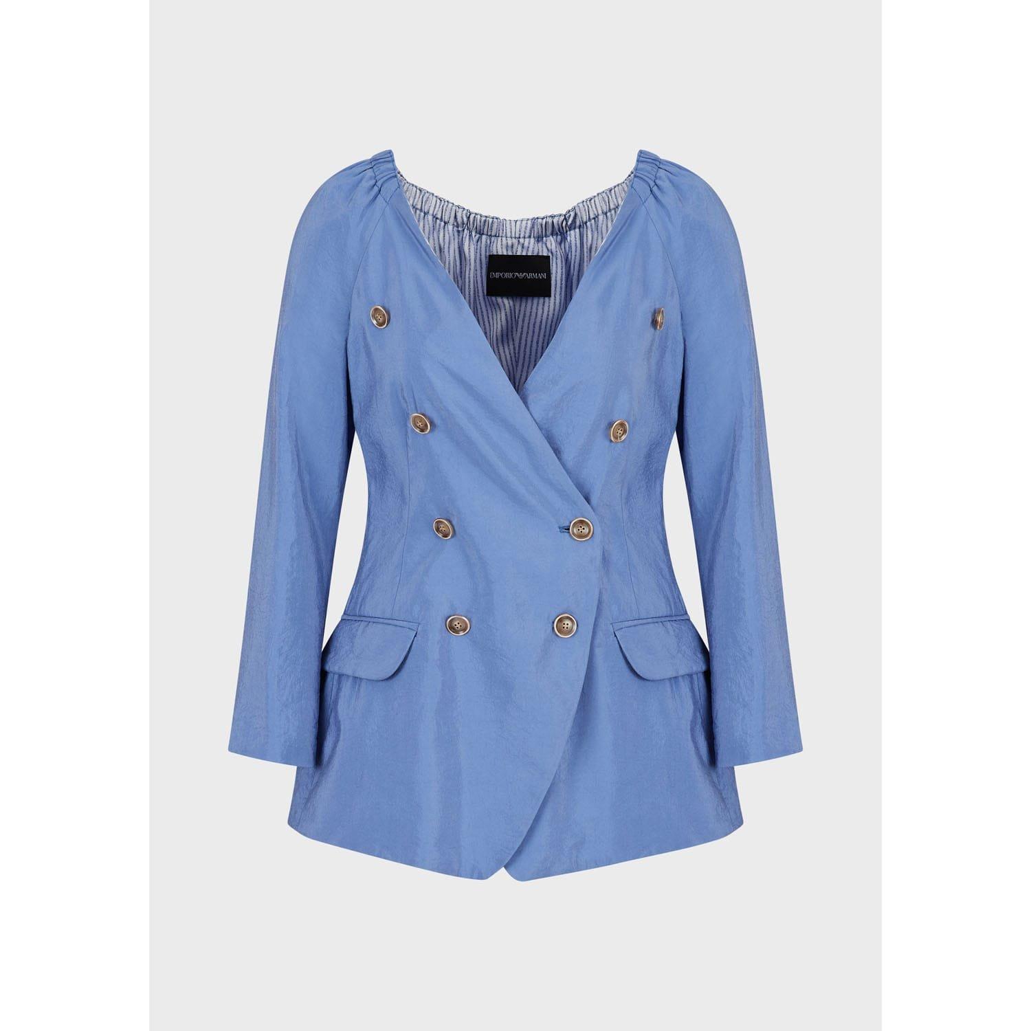 It features a plunging V-neckline three-quarter length sleeves with elasticized shoulders and a striped lining. Double-breasted.