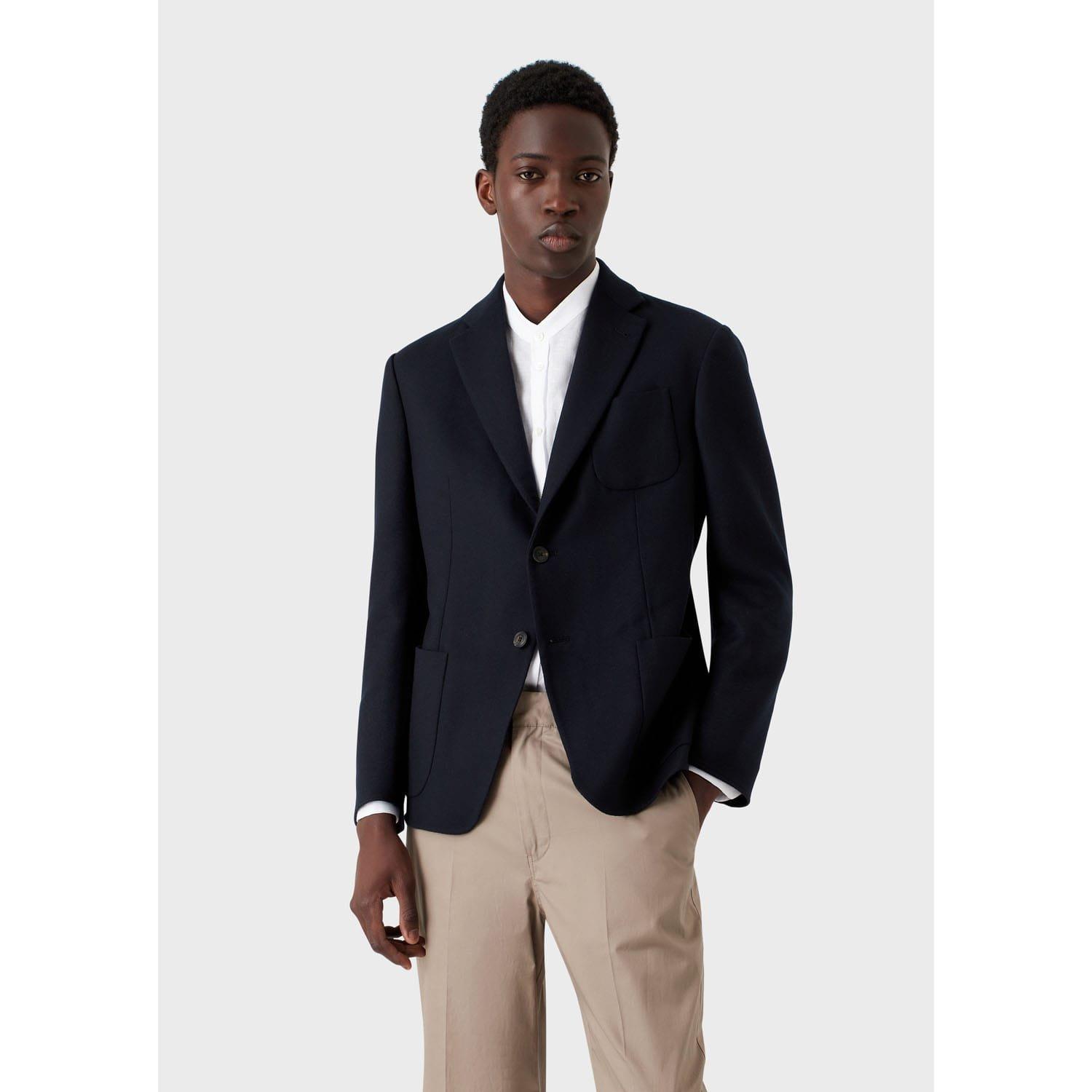 A navy single-breasted jacket made from materials like virgin wool or a wool blend often unlined for a softer more natural shape.