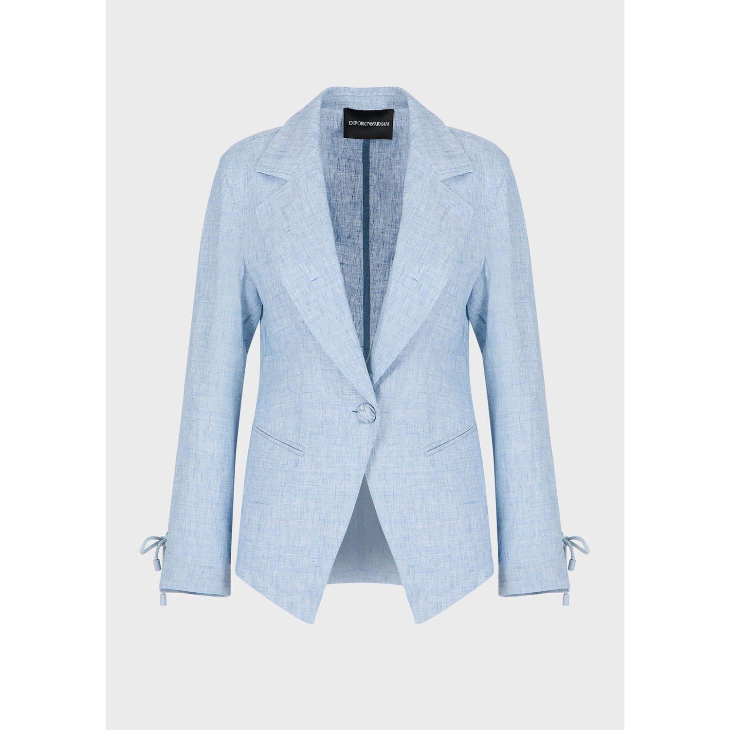 Single-breasted with a one-button closure notched or wide lapels and tie details at the cuffs of the long sleeves. Slim fit.