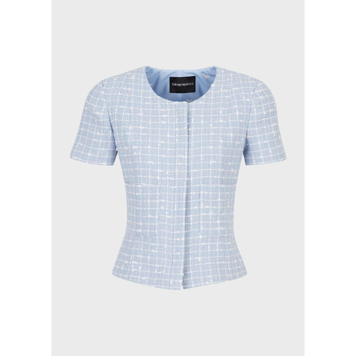 Crew neckline. Short sleeves. Hidden zip front closure. Front patch pockets. Checked tweed pattern.