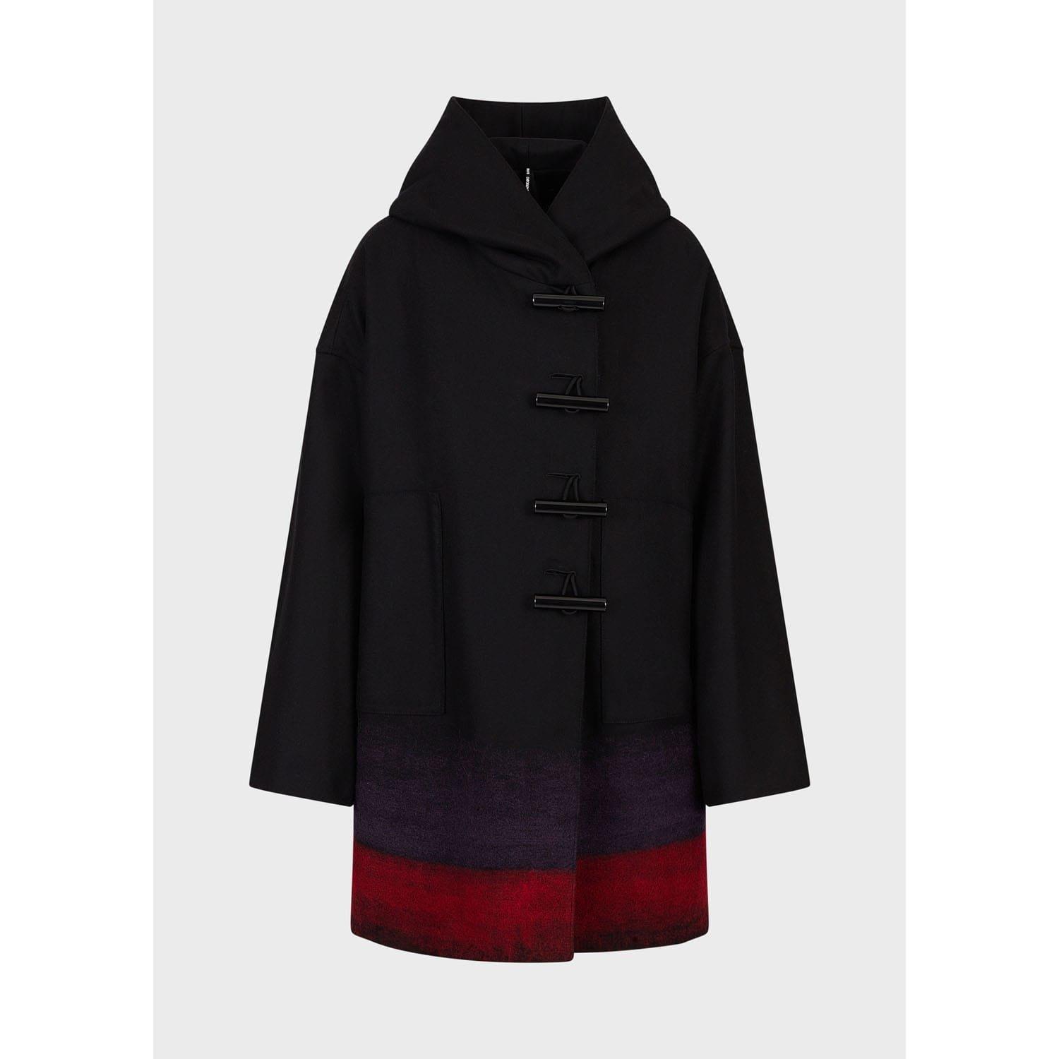 Duffel-style coat with toggle buttons and a hood. The bottom portion of the coat features a color-block pattern with shades of purple dark red and black.
