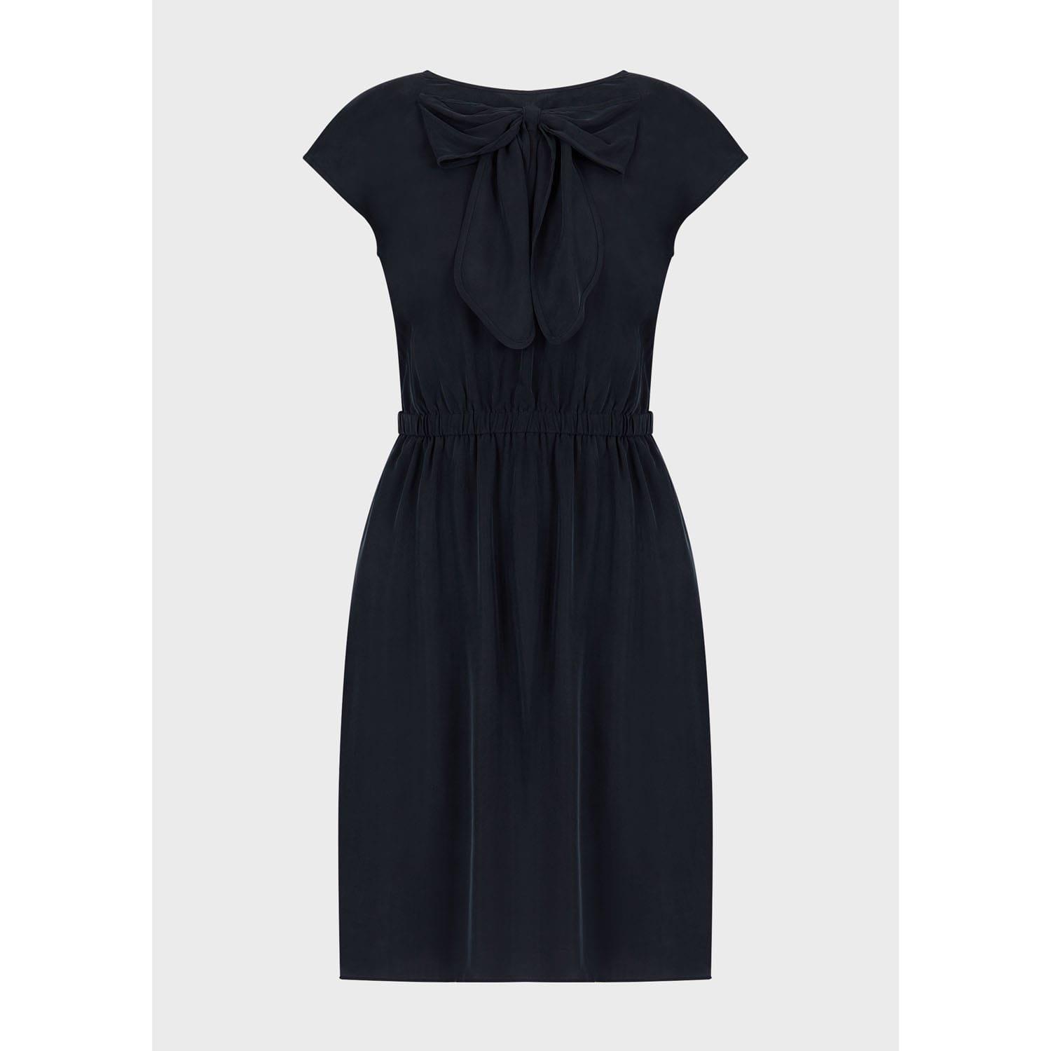 Boat neck. Cap sleeves. Bow on the front. Regular fit.