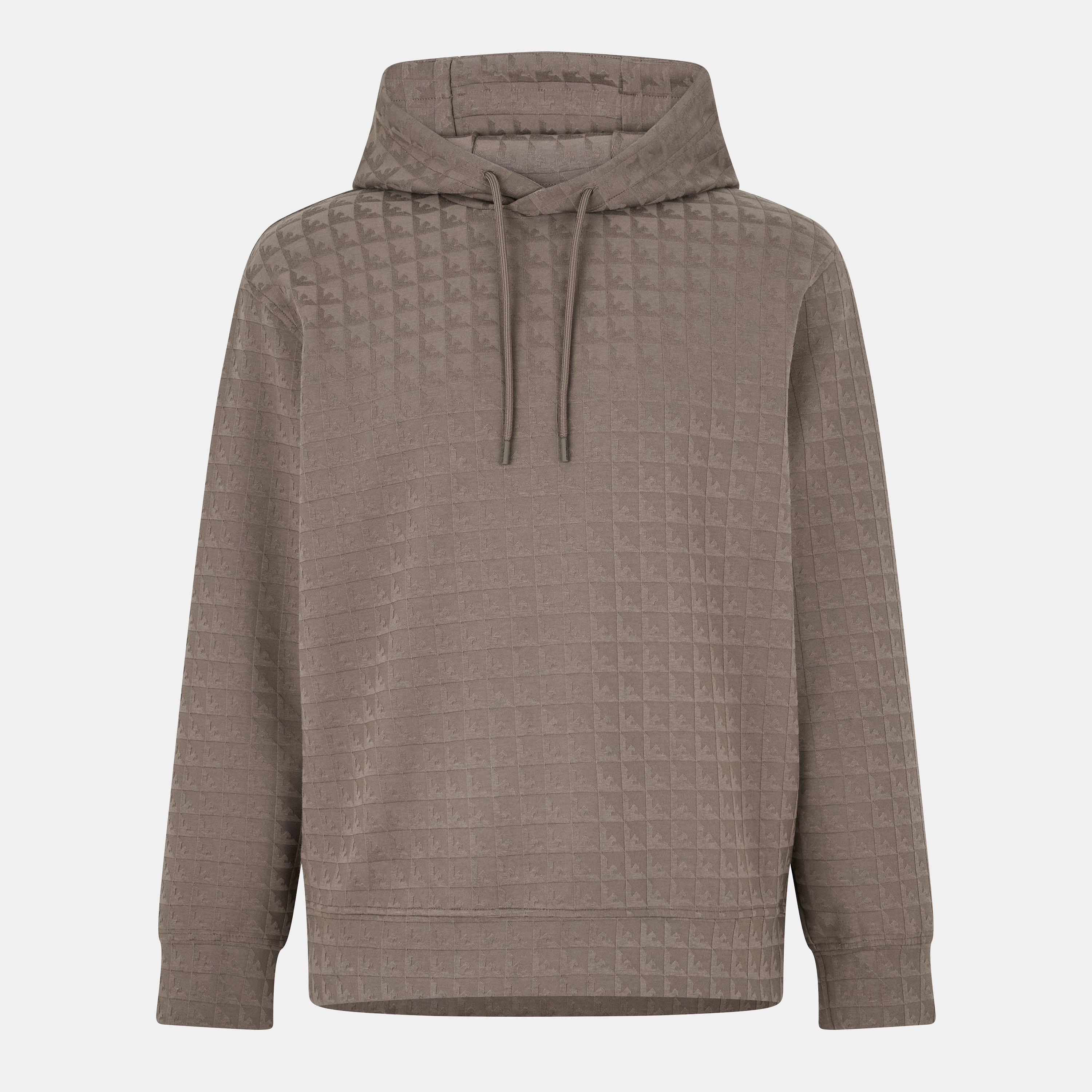 Emporio Armani's Men's Pull Over Hoodie offers sleek design with everyday comfort. This sweatshirt features a streamlined shape with branded details throughout, while the adjustable hood and ribbed finishes create a structured yet relaxed fit that complements your casual wardrobe.