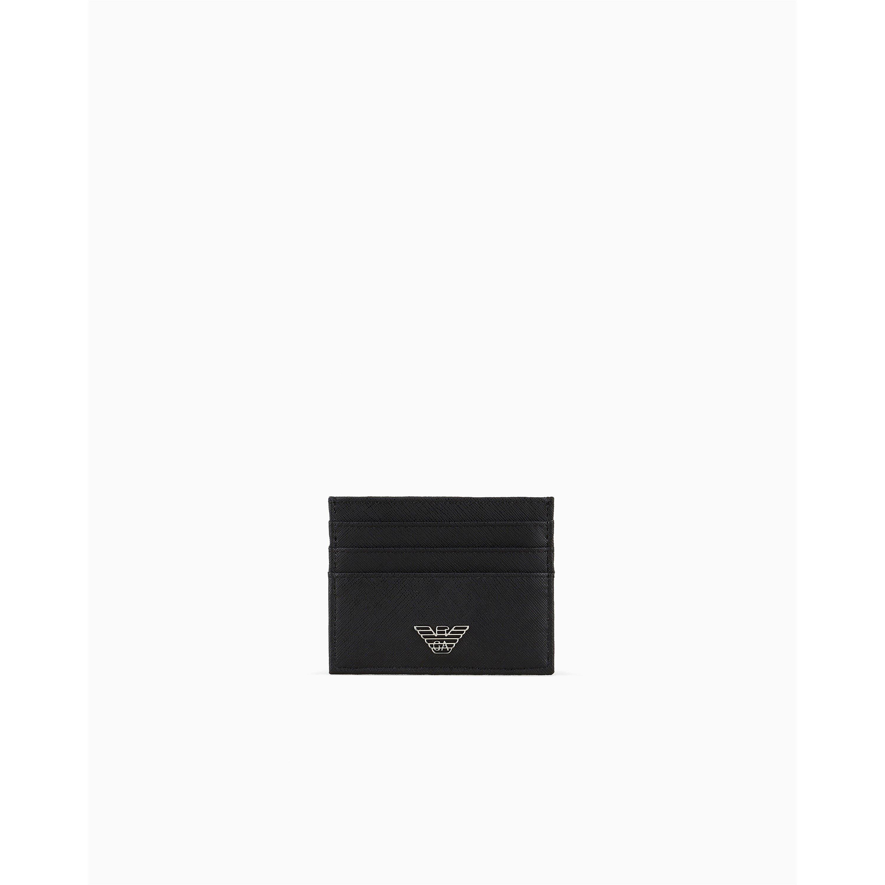 The Emporio Armani Men's Saffiano Leather Eagle Badge Card Holder is built with a streamlined design for everyday organisation. The metallic eagle badge provides a striking finish.