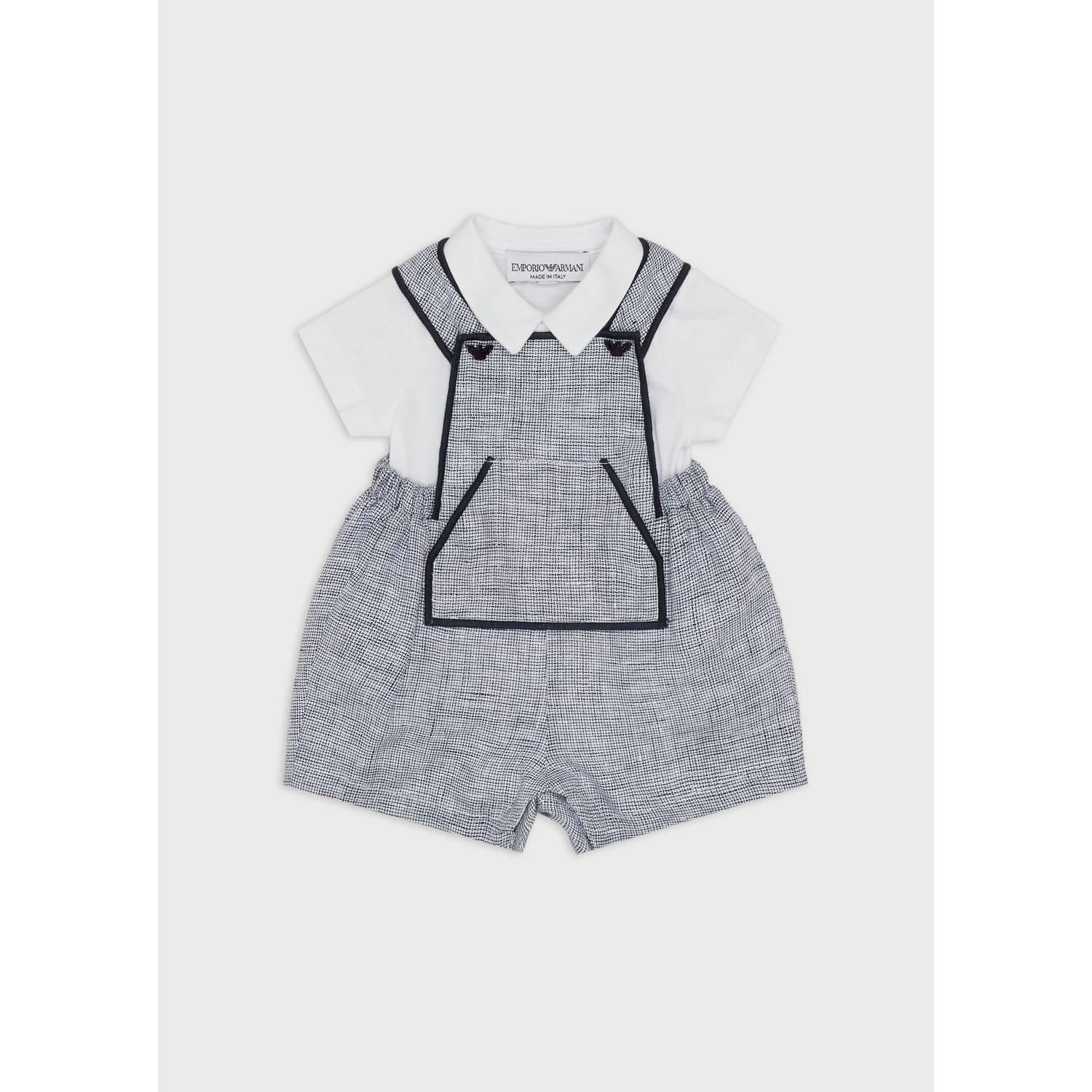 Boy's Emporio Armani Infants Gift Box Set. The stretchy white cotton jersey bodysuit fastens with easy-to-use poppers on the front and between the legs so always looks neat and never becomes untucked. The short linen dungarees are woven with blue and white thread and have embroidered navy blue trims. The shoulder straps fasten with poppers covered with decorative navy blue Eagle logo charms. They are fully lined in cotton voile for comfort have a front pouch and fasten with poppers between the legs. The waist is elasticated on the sides for a comfortable fit. Material: 100% Linen. Ref: 3RNV05N0IZF711.