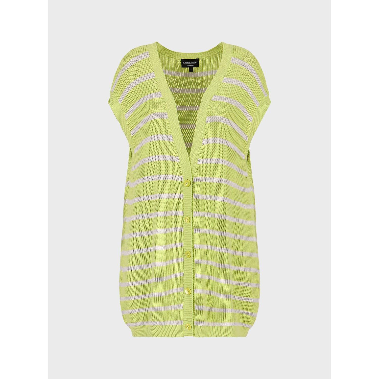 Plunging V- neck. Sleeveless. Front button fastening. Horizontal-stripe print knitted. Green and off-white striped. Intarsia knit with ribbed trim.
