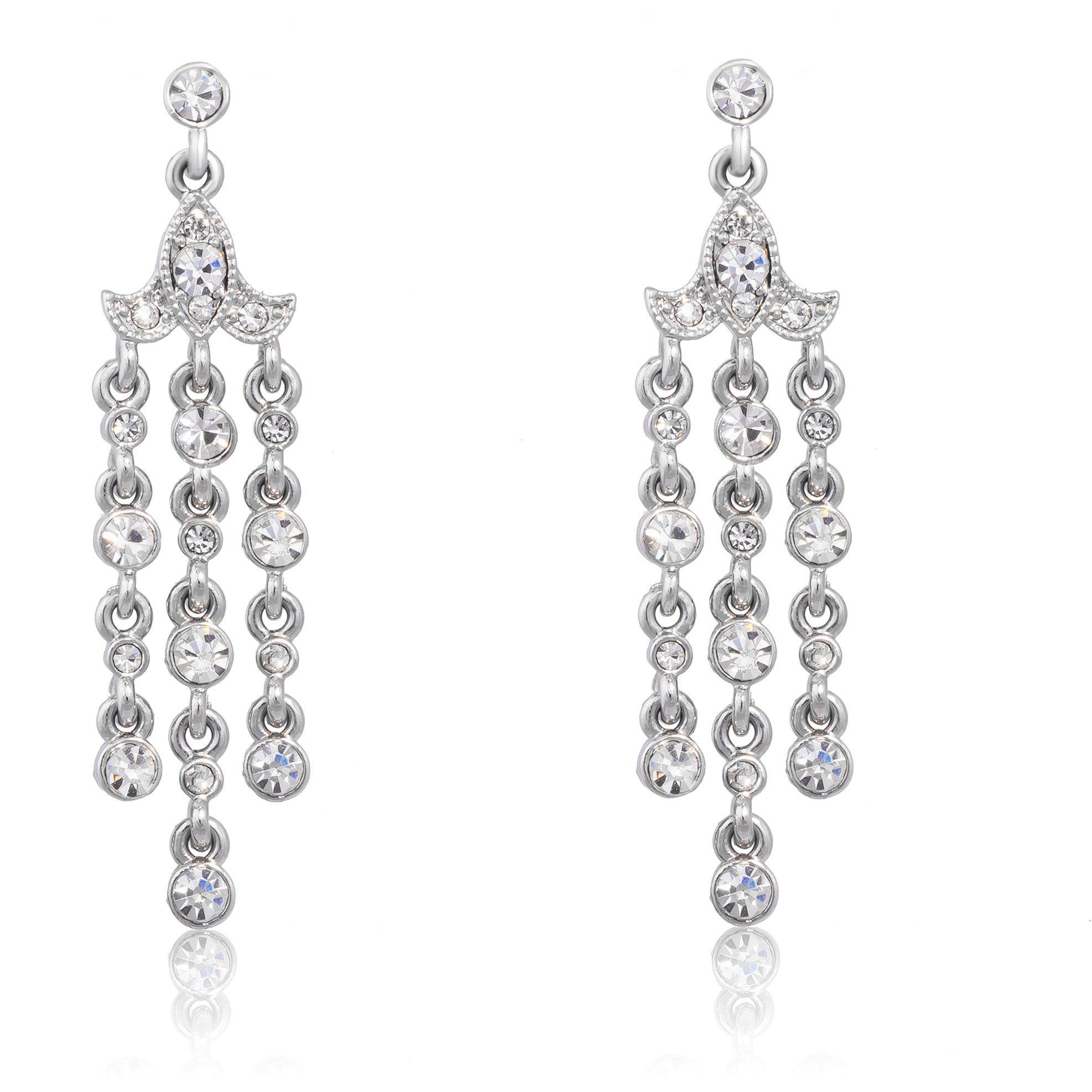Introducing the Premium Range by Espree Three rows of cascading hand set crystals that shimmer as they catch the light create these stunning dropper earrings. As it flashes off each stone they dazzle with their brilliance, a must for any special occasion. Finished in lustrous white rhodium these gorgeous vintage style earrings come packaged in our Luxury Elite gift box. See also the matching pendant. For pierced ears only. NON-RETURNABLE DUE TO HYGIENE REASONS