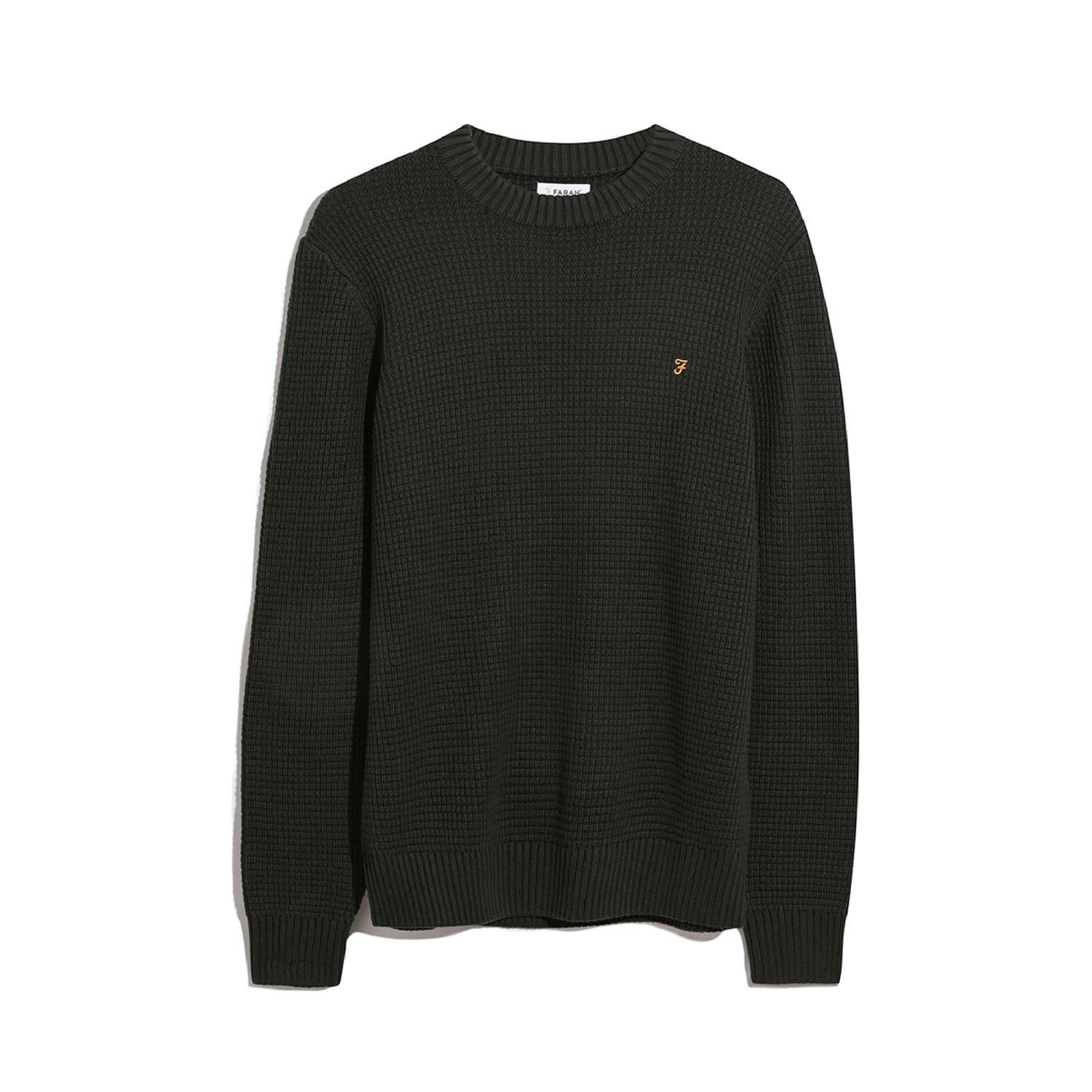 Mens Farah Foraker Crew Neck Sweater in black - Double bound ribbed neck. - Knitted rib cuffs and hem. - Embroidered Gold F branding. - 7 Gauge full cardigan stitch construction. - Premium organic cotton fabrication. - Regular fit. - 100% organic cotton. Machine washable. - Ref: F4GHE022111