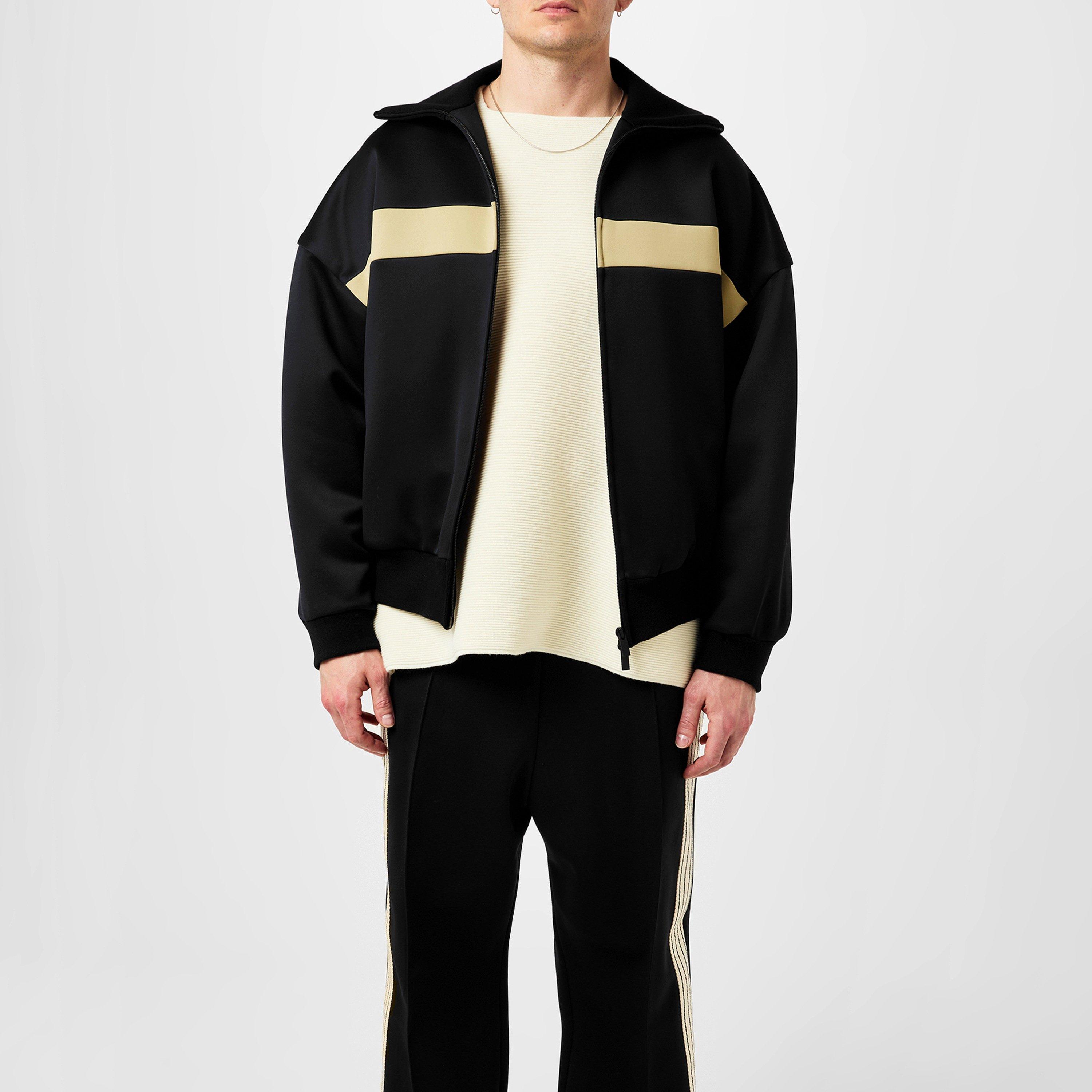 The contrasting colour chest stripe, adds subtle style and edge to its timeless design. The leather logo embossed label embroidered at the rear symbolises the brand's commitment to quality craftsmanship. Designed as the perfect layering piece in transitional months, this track jacket effortlessly elevates any outfit. Whether it's a casual day out or a stylish evening event, Fear Of God ensures you make a bold statement.