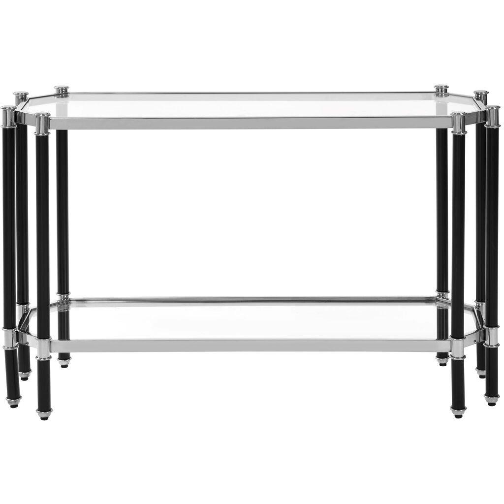The Allessi console table boasts two tiers of clear tempered glass held in place by a sleek stainless steel frame. Three legs at each side are finished in black and feature chrome accents for a reflective contrast.