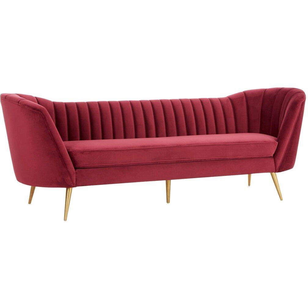This large three seat sofa is dressed with soft wine velvet. Its channel tufting gives it a textured look, and the flared shoulders add a touch of drama to its silhouette. The brushed gold legs create a luxe finish.
