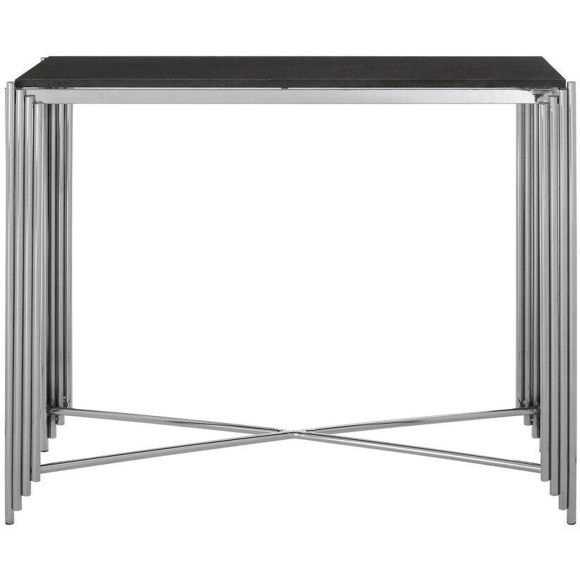 This striking console table features a luxurious, dark granite top, showcasing its natural durability and elegance. It is supported by a sophisticated stainless steel frame, which is composed of multiple slender, highly polished vertical rods and reinforced by modern X-shaped cross-bracing at the base. The combination of rich granite and gleaming steel creates a sleek, contemporary statement piece for any entryway or living area.