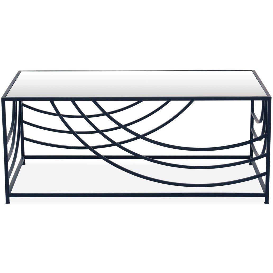 This coffee table introduces industrial with a series of three lines on each side creating a curved aesthetic. The clean and open frame supports a wide mirrored glass top that lends the design a touch of reflection and elegance.