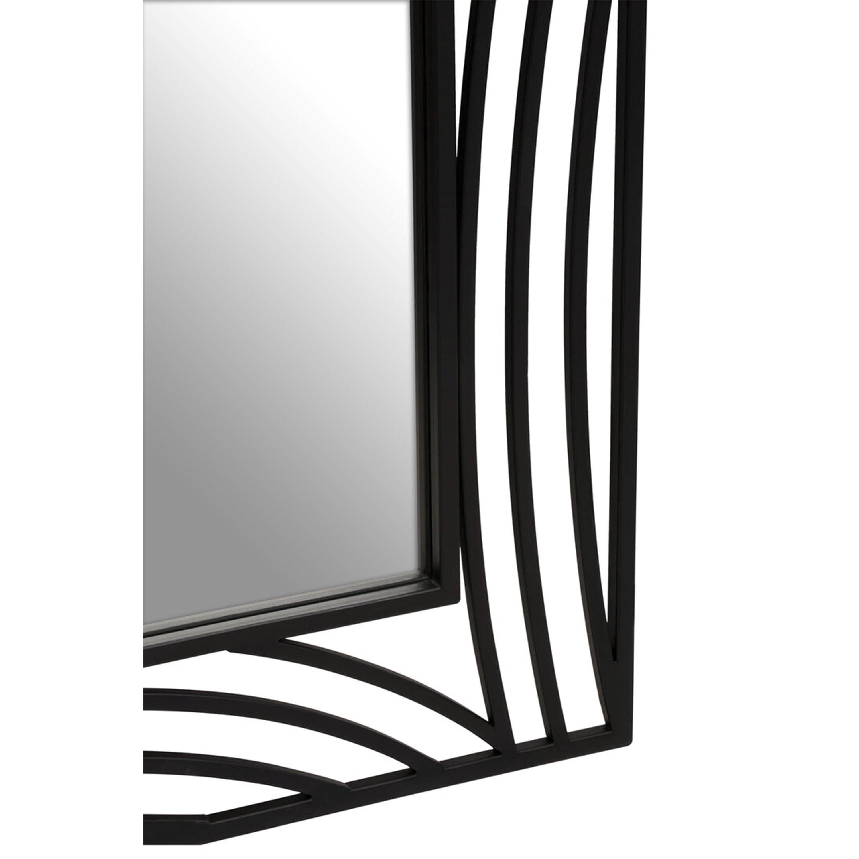 This wall mirror features a series of black finish curved lines forming the border of its frame. The minimally designed frame with an open aesthetic creates a monochrome contrast with the reflective mirrored glass.