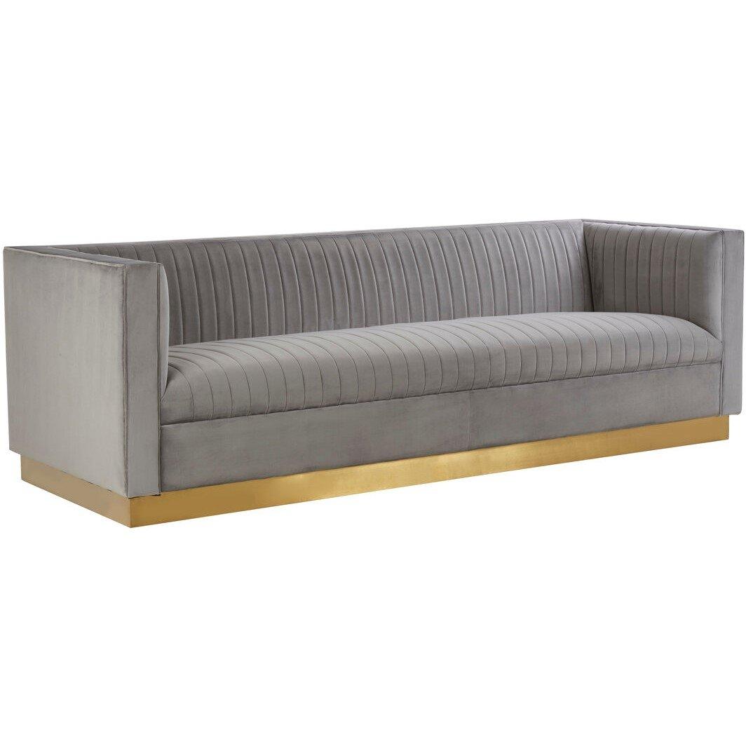 This 3-seat sofa will be a sophisticated addition to a contemporary home with its clean lined design in soft grey velvet upholstery. Channel tufting lends a touch of tactile texture to the padded seat and backrest. The warm metallic base contributes to the glam appeal of this statement piece.