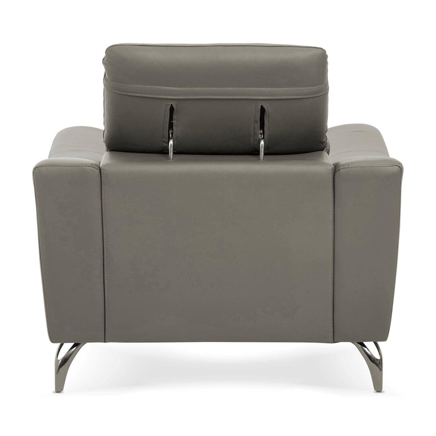 The Padua armchair features grey leather upholstery with thick foam padding. The unique design and shape give a contemporary feel, while the horizontal channel-back and pillow-top armrests make a visual statement in the living area.