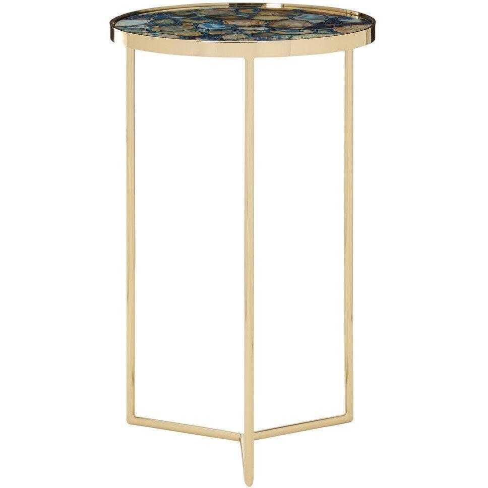 This side table's top is crafted from semi-precious blue agate stone featuring a banded pattern with asymmetric natural trim. The exquisite top rests in the gold finish sculptural frame that contributes to modern minimalism.