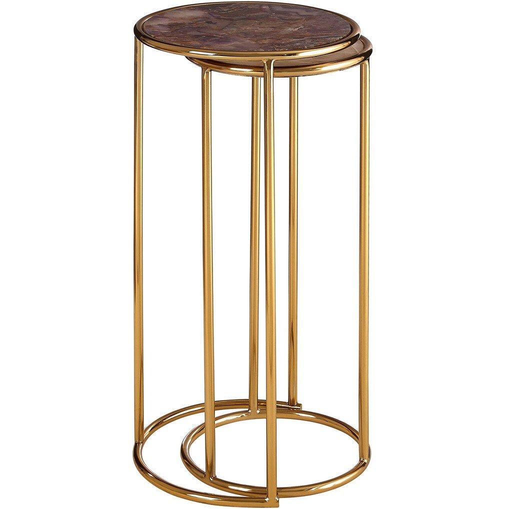 The Vita luxurious set of two nesting tables feature amethyst stone tops with natural, swirling patterns in rich tones. They are supported by sleek, minimalist gold-finished metal frames that provide a modern and elegant contrast to the organic stone. When not in use, the smaller table can be neatly tucked under the larger one.