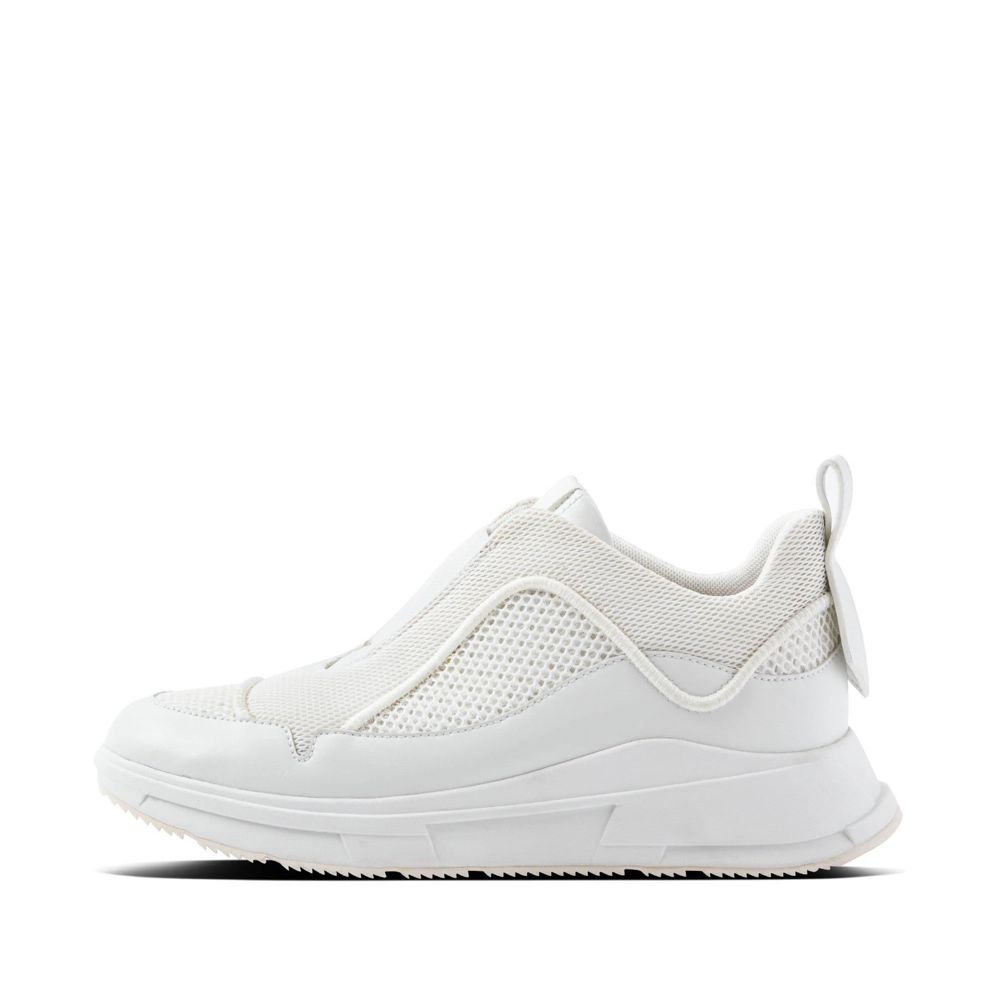Smooth Synthetic panels and breathable mesh knit. Slip on closure. Heel tab. Chunky rubebr sole with textured tread.