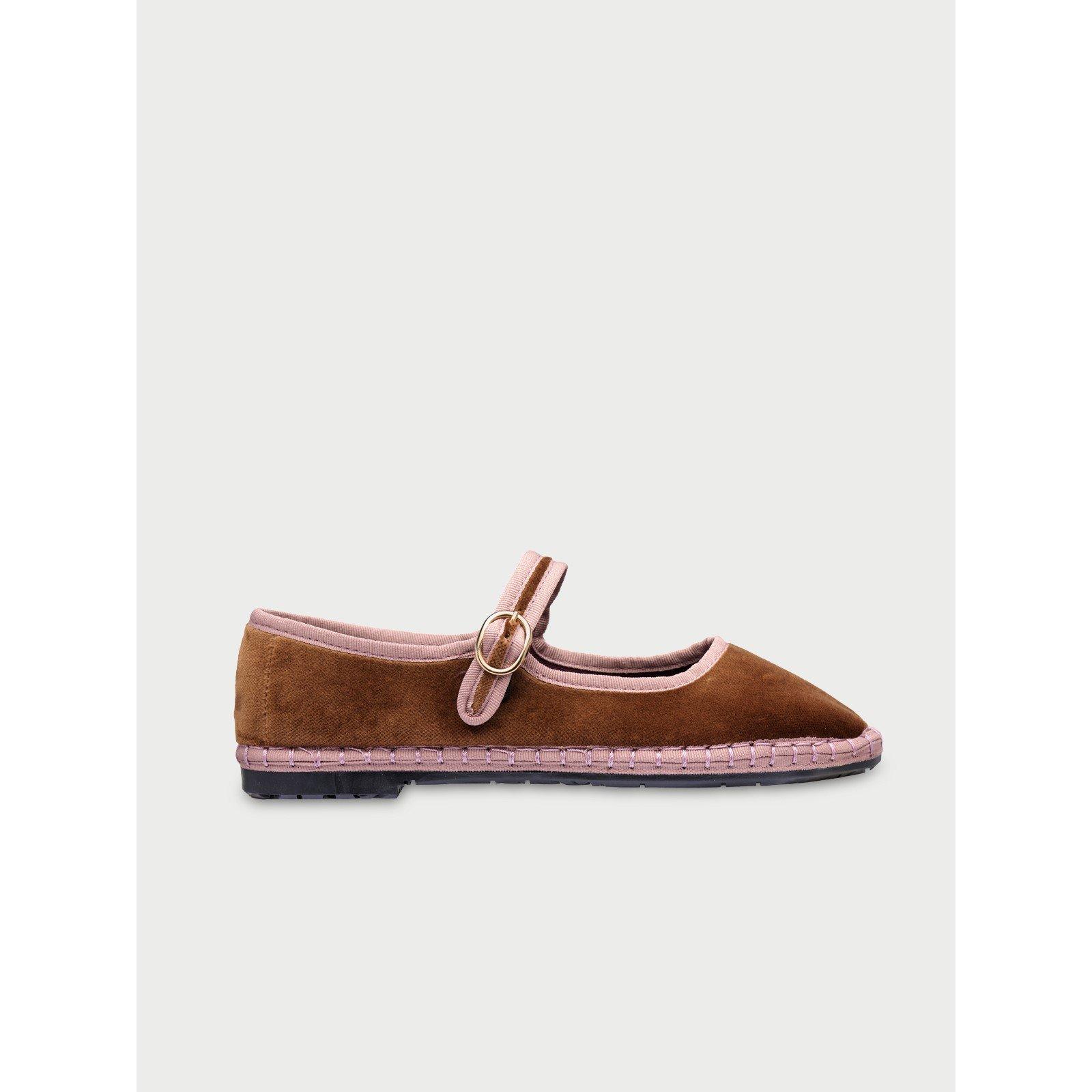 Velvet mary jane in brown with light pink piping and buckle closure. The outside of the shoe is 100% cotton velvet, and the inside of the shoe is 100% organic cotton with anti-bacterial treatment. The sole is made of rubber produced from recycled bicycle tyres.