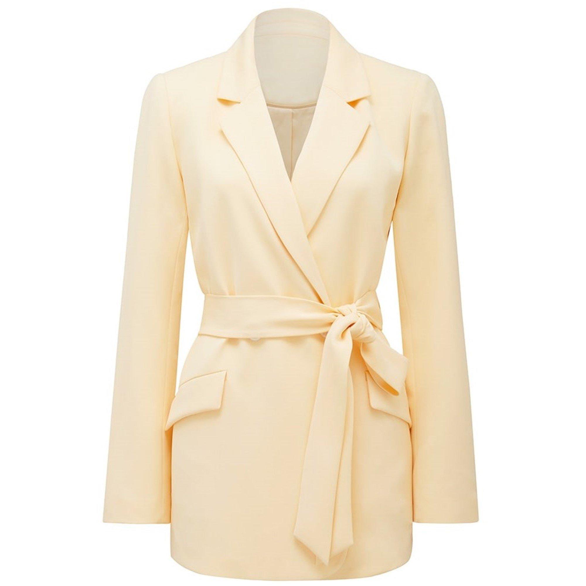 - Double-breasted design creates a tailored appearance