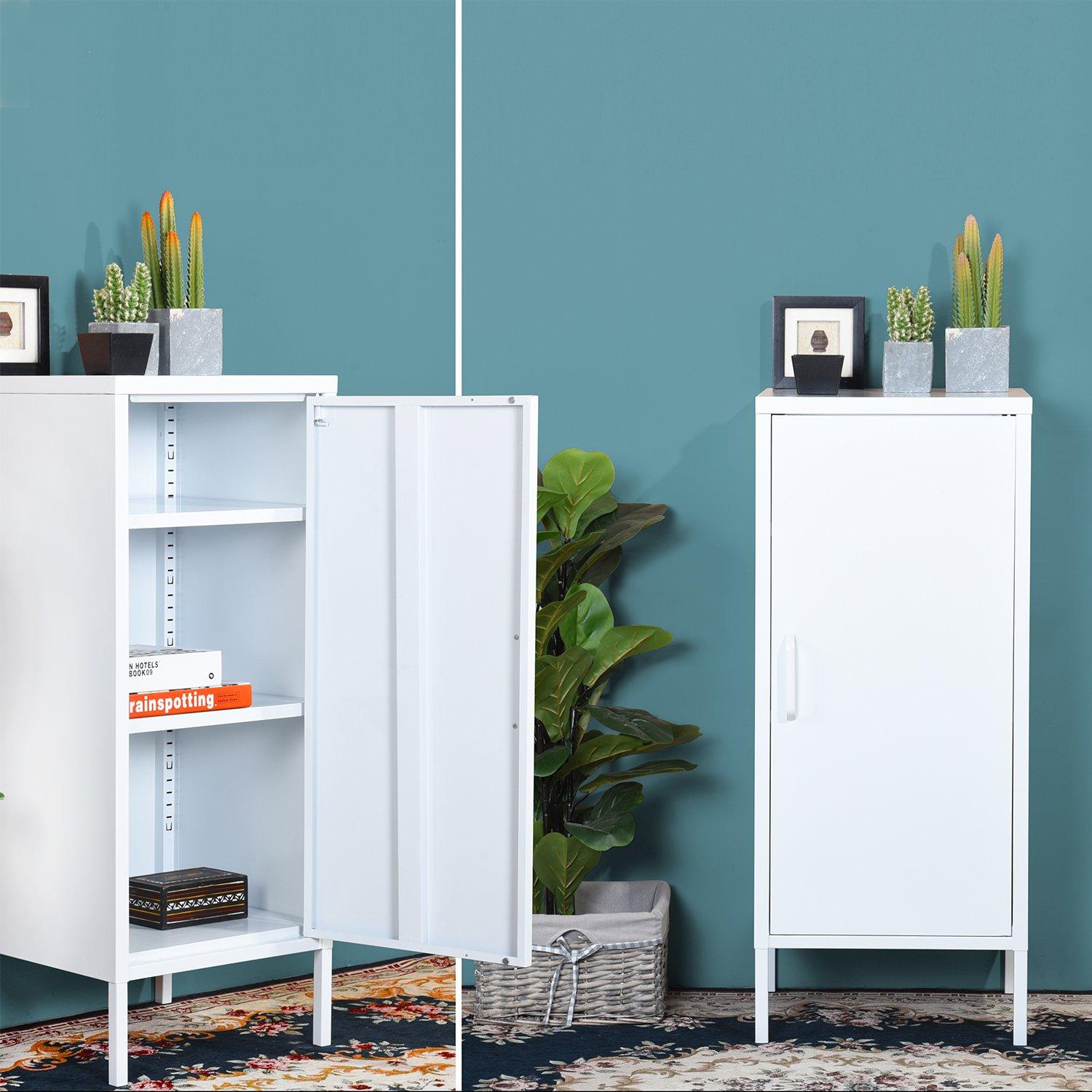 This metal storage cabinet provides a practical solution for organizing everyday items at home or in the office. Featuring three fixed shelves and a tall, slim structure, it offers generous storage without taking up much floor space. Whether used to store documents, kitchen supplies, or household tools, its clean-lined design fits seamlessly into various interiors. The hinged door ensures contents stay out of sight for a tidy look.