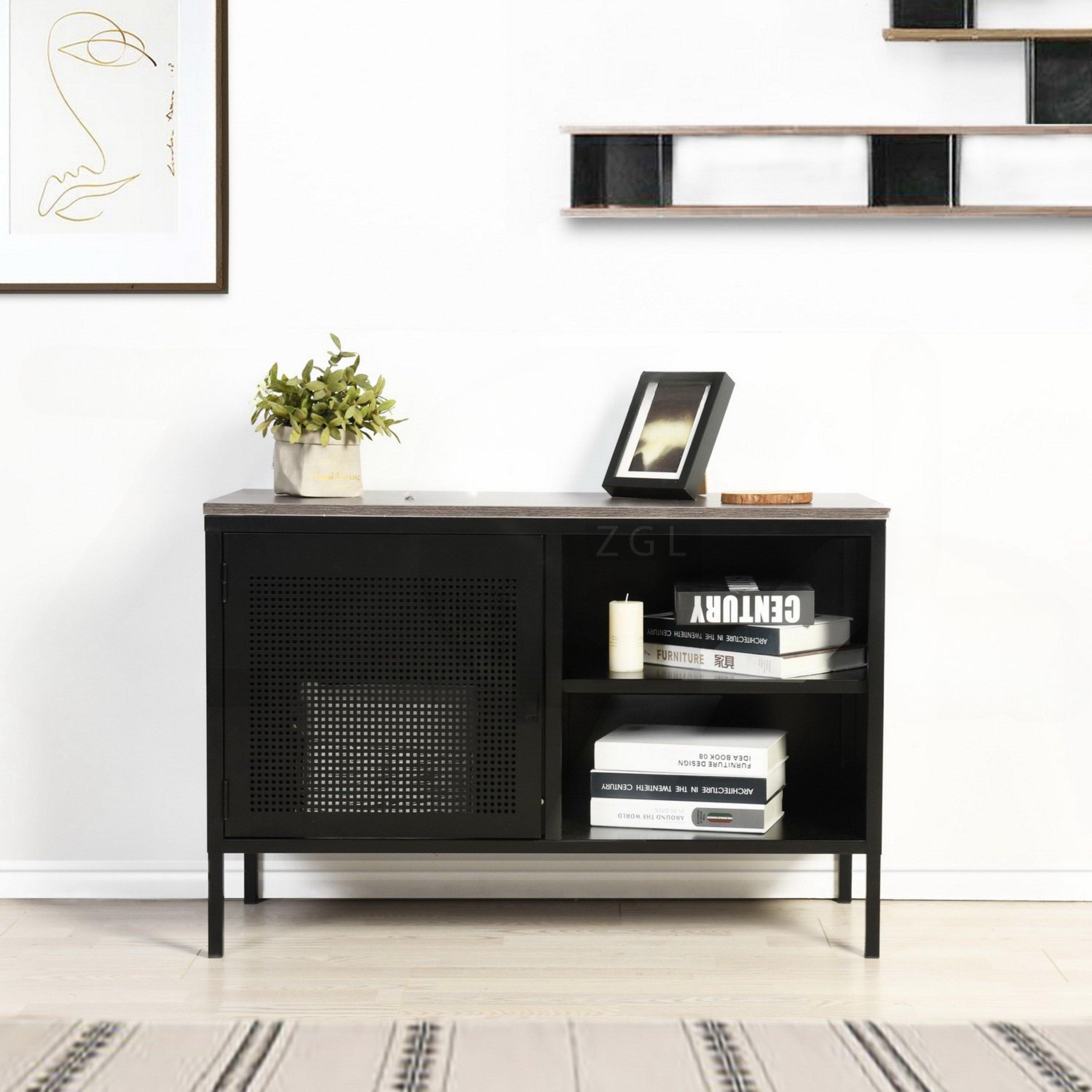 Product Information Overall Dimensions: 96.5 cm (W) x 40 cm (D) x 64.5 cm (H) Cabinet Door Size: 50 x 49.5 cm Open Shelf Heights: 20.5 cm each Panel Thickness: 1.7 cm Ground Clearance: 2 cm Materials: Metal frame, wood-effect tabletop Assembly Required: Yes