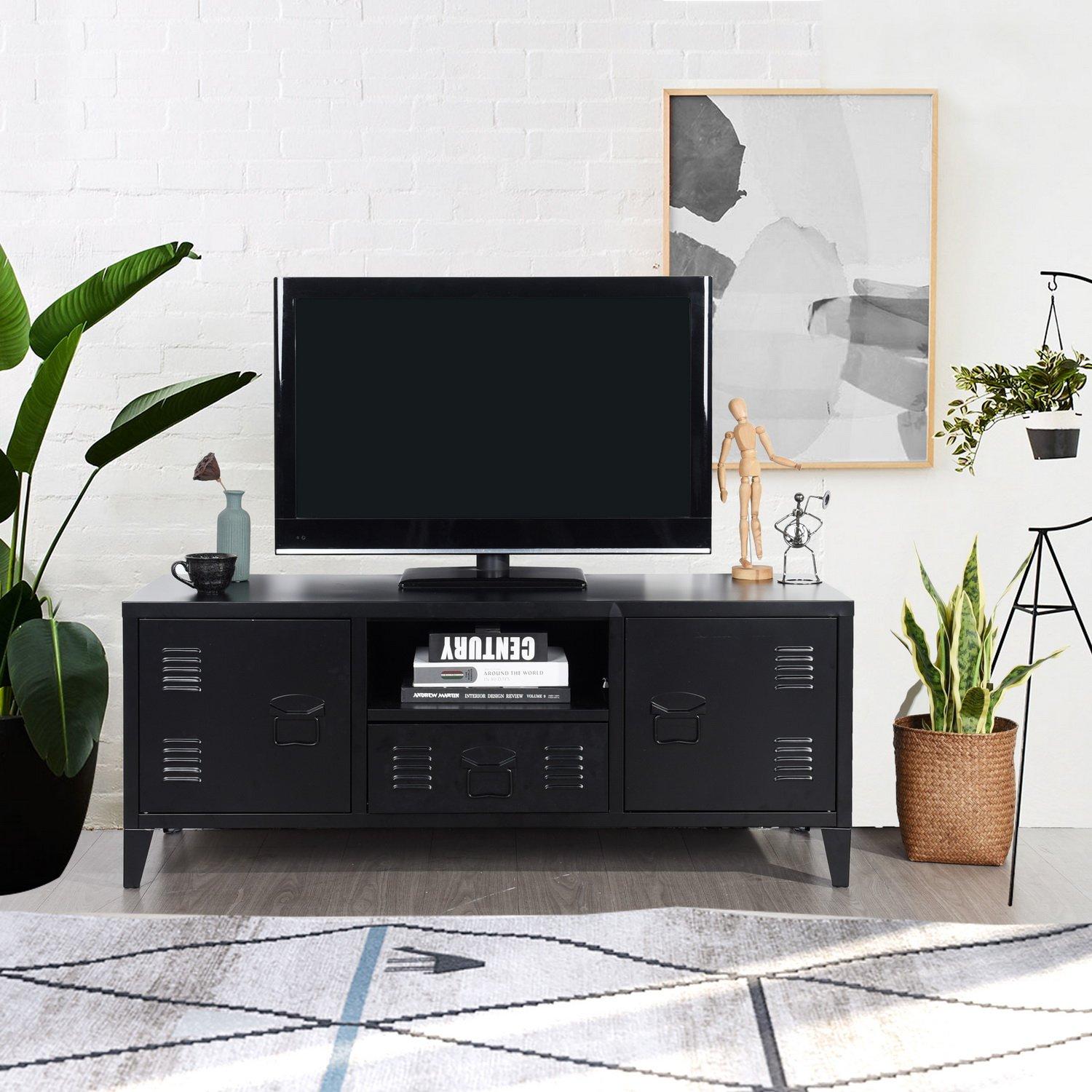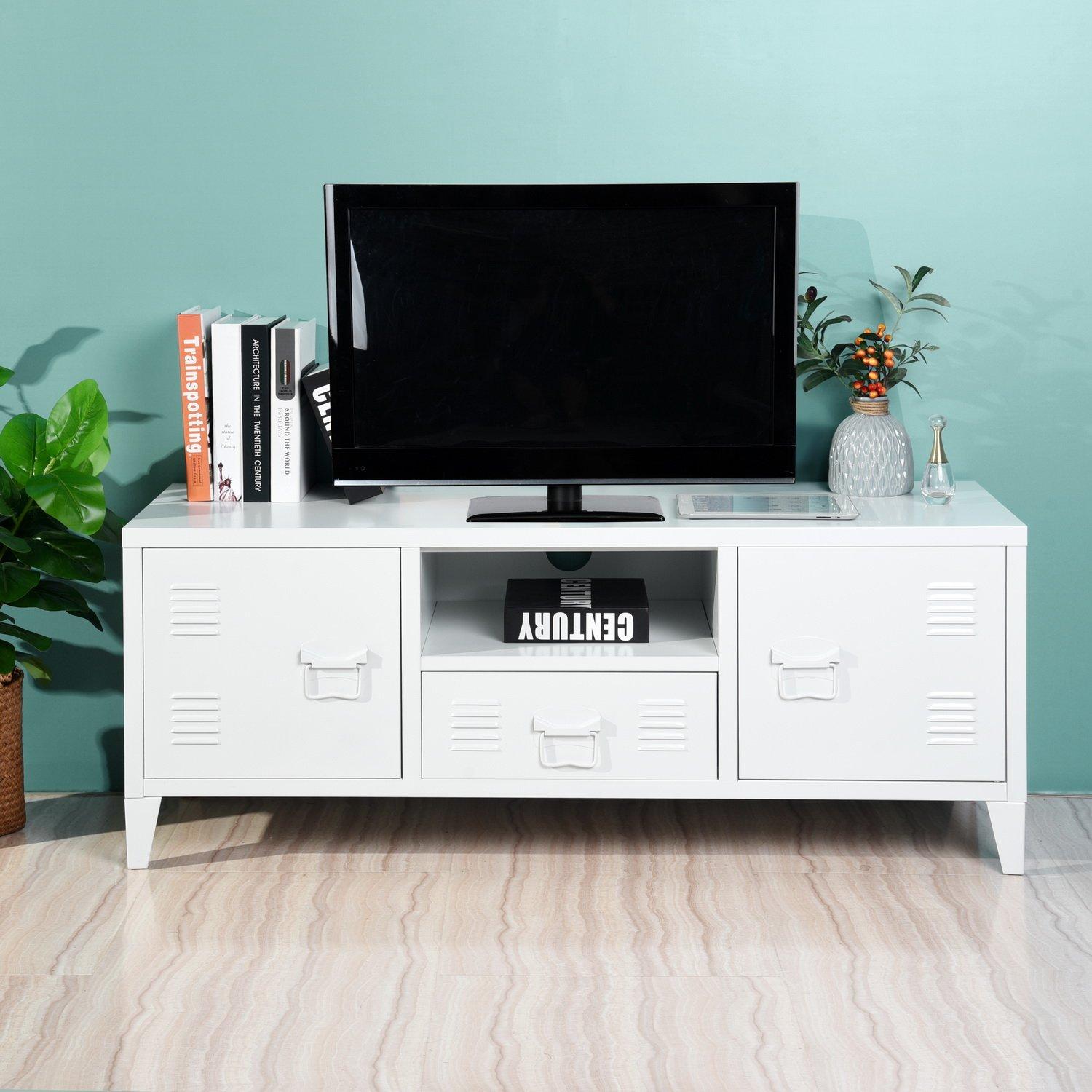 Ample Storage Options – Includes side cabinets, center drawer, and open shelf for organized media equipment. Durable Metal Build – Made of robust steel for long-lasting structure and stability. Smart Cable Management – Rear cut-out keeps cords neatly tucked away and organized. Modern Industrial Style – Locker-style doors and matte finish add a bold touch to any living space. Compact & Functional – Fits TVs up to 50 inches, ideal for apartments or compact rooms.