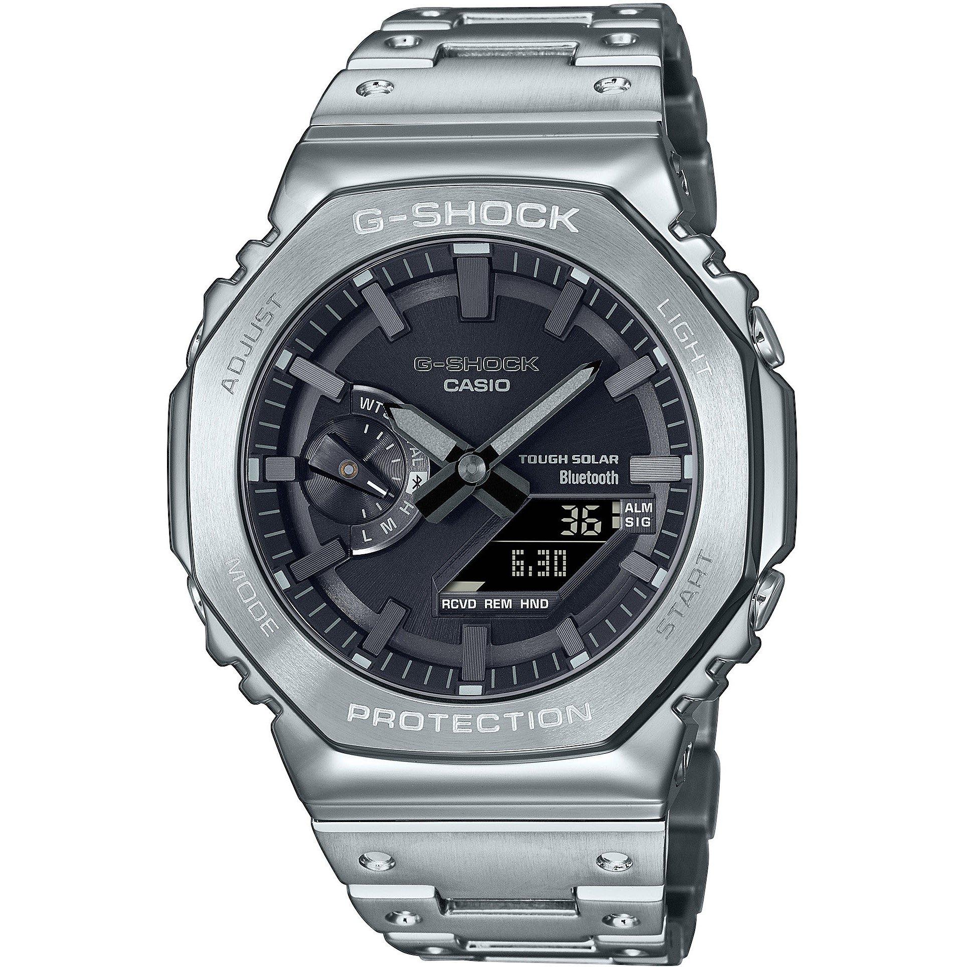 Introducing the first full-metal addition to the continually evolving 2100 line of timepieces that inherit the legacy of the first-ever G-SHOCK, the DW-5000C. The full-metal construction with a screw-back case, bezel, and band crafted in stainless steel creates a streamlined, minimalist design, while protecting the module from impact when dropped. We take it way back with the octagonal bezel and dimpled band design of the original from 1983, all done in metal. High-density mounting keeps the analogue-digital combination module slim, while still providing the advanced functions you love in a compact profile and comfortable fit. The GM-B2100GD-5AER pairs with a smartphone via Bluetooth®. Simply tap into the dedicated app for precision timekeeping that keeps you on track. With Tough Solar, a high-brightness LED light and a range of other convenient functions, this is a timepiece that delivers on style and practical utility.