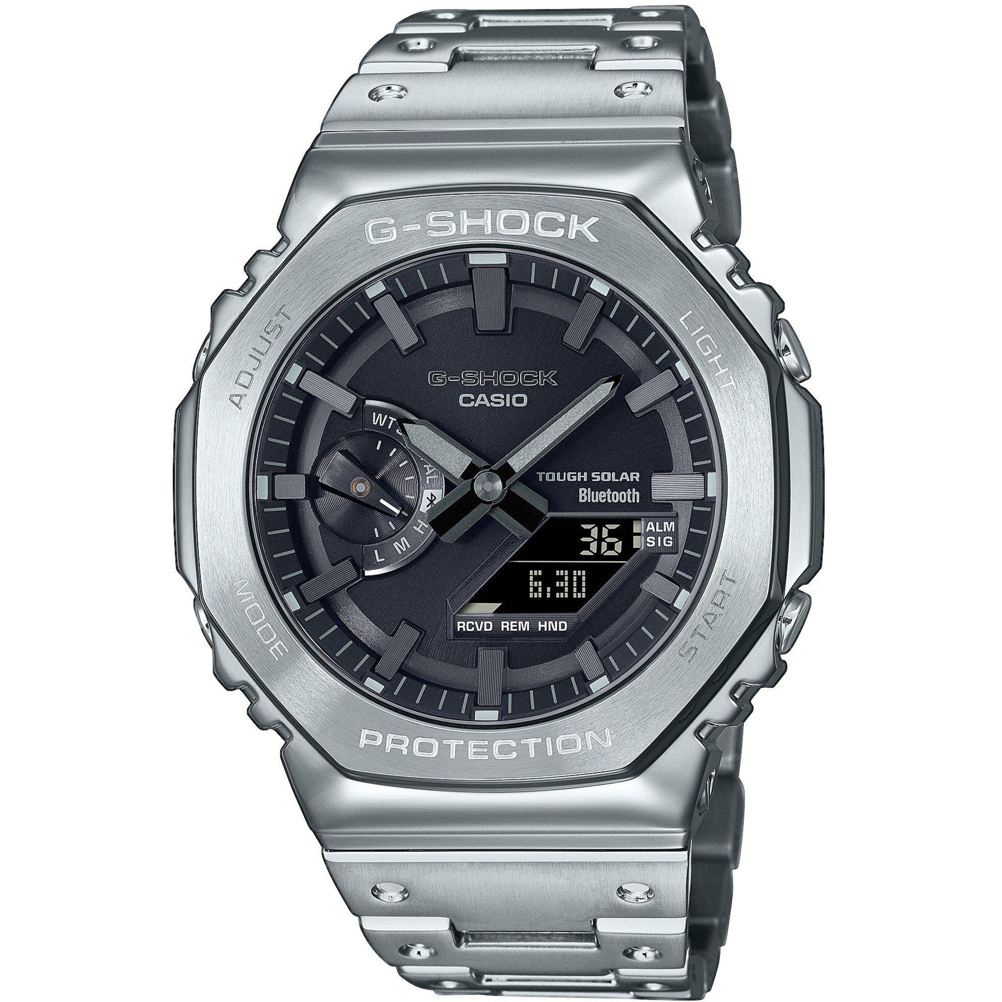 Introducing the first full-metal addition to the continually evolving 2100 line of timepieces that inherit the legacy of the first-ever G-SHOCK, the DW-5000C. The full-metal construction with a screw-back case, bezel, and band crafted in stainless steel creates a streamlined, minimalist design, while protecting the module from impact when dropped. We take it way back with the octagonal bezel and dimpled band design of the original from 1983, all done in metal. High-density mounting keeps the analogue-digital combination module slim, while still providing the advanced functions you love in a compact profile and comfortable fit. The GM-B2100D-1AER pairs with a smartphone via Bluetooth®. Simply tap into the dedicated app for precision timekeeping that keeps you on track. With Tough Solar, a high-brightness LED light and a range of other convenient functions, this is a timepiece that delivers on style and practical utility.