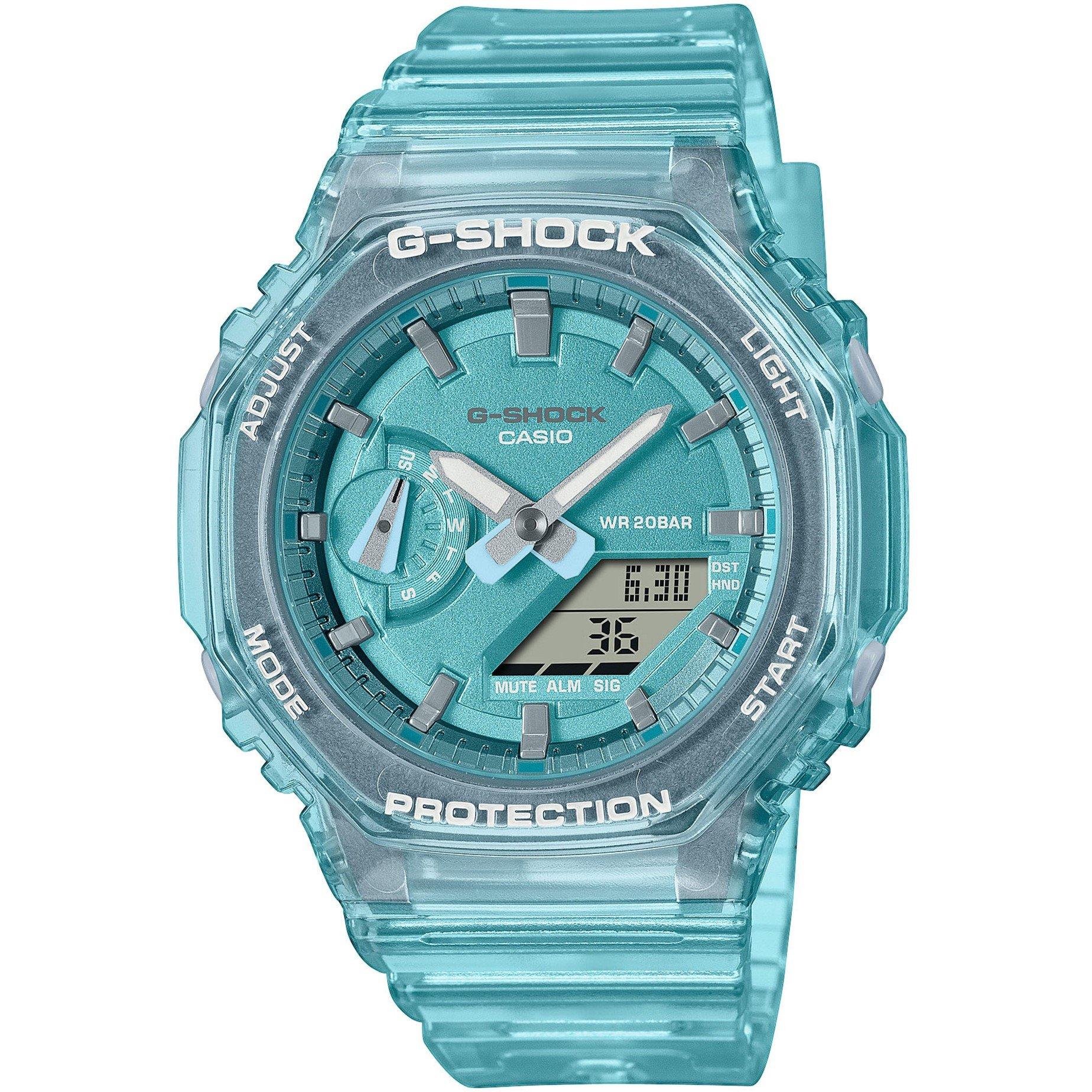 SKELETON X METAL DIAL-Slip on a splash of clear metallic styling with the ever-popular analogue/digital combination GA-2100 in a slimmer, more compact profile. Metallic translucent designs in a choice of colours provide versatility for any occasion. The GMA-S2100SK-2AER is a deep turquoise colour with the index markings treated with a half-matte vapour deposition finish which brings to life the clear metallic look. Functions include a stopwatch, countdown timer, 200M water resistance and an LED light.
