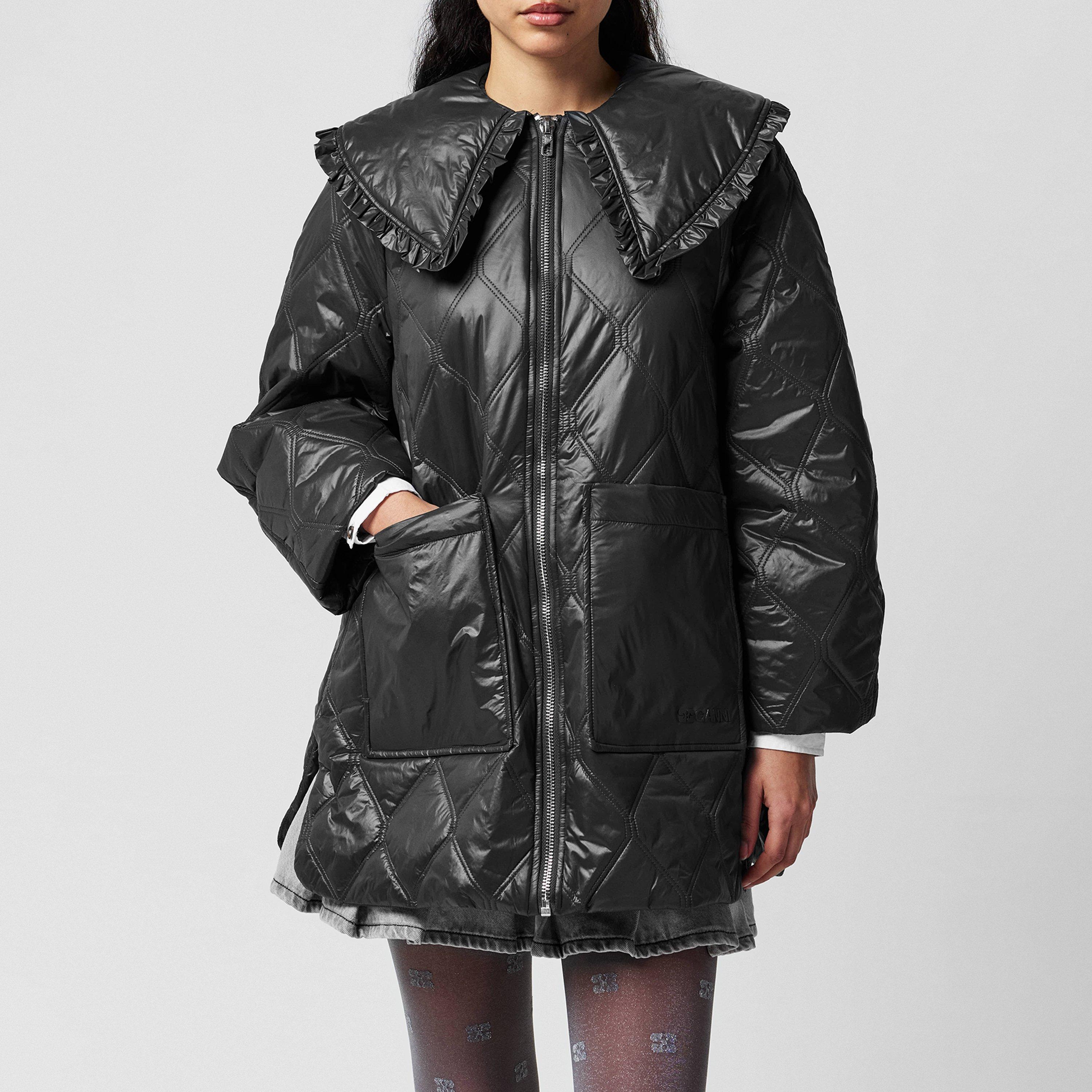 The Ganni Quilted Insulated Cropped Short Puffer Jacket delivers sculptural volume with contemporary style. Featuring a structured quilted design, this winter coat balances substantial warmth with lightweight wearability through its insulated core.