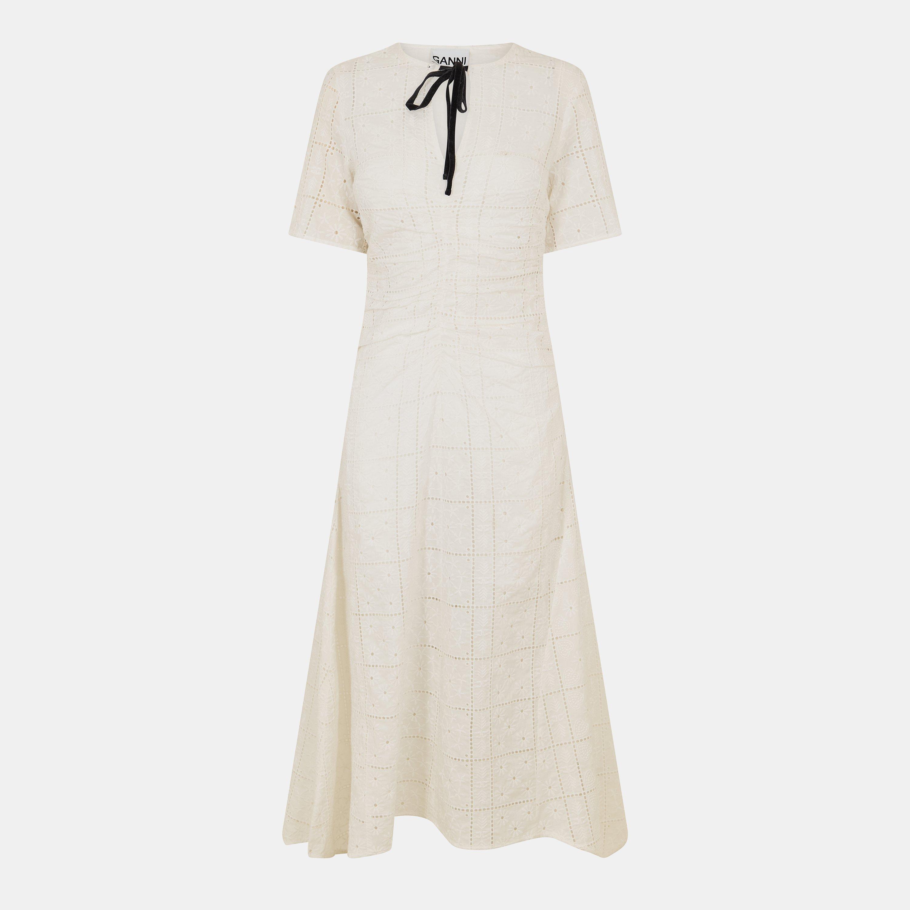 Featuring intricate anglaise detailing, the Ganni Anglaise Maxi Dress brings texture and visual interest to a floor-length design. The long design flows with natural ease.