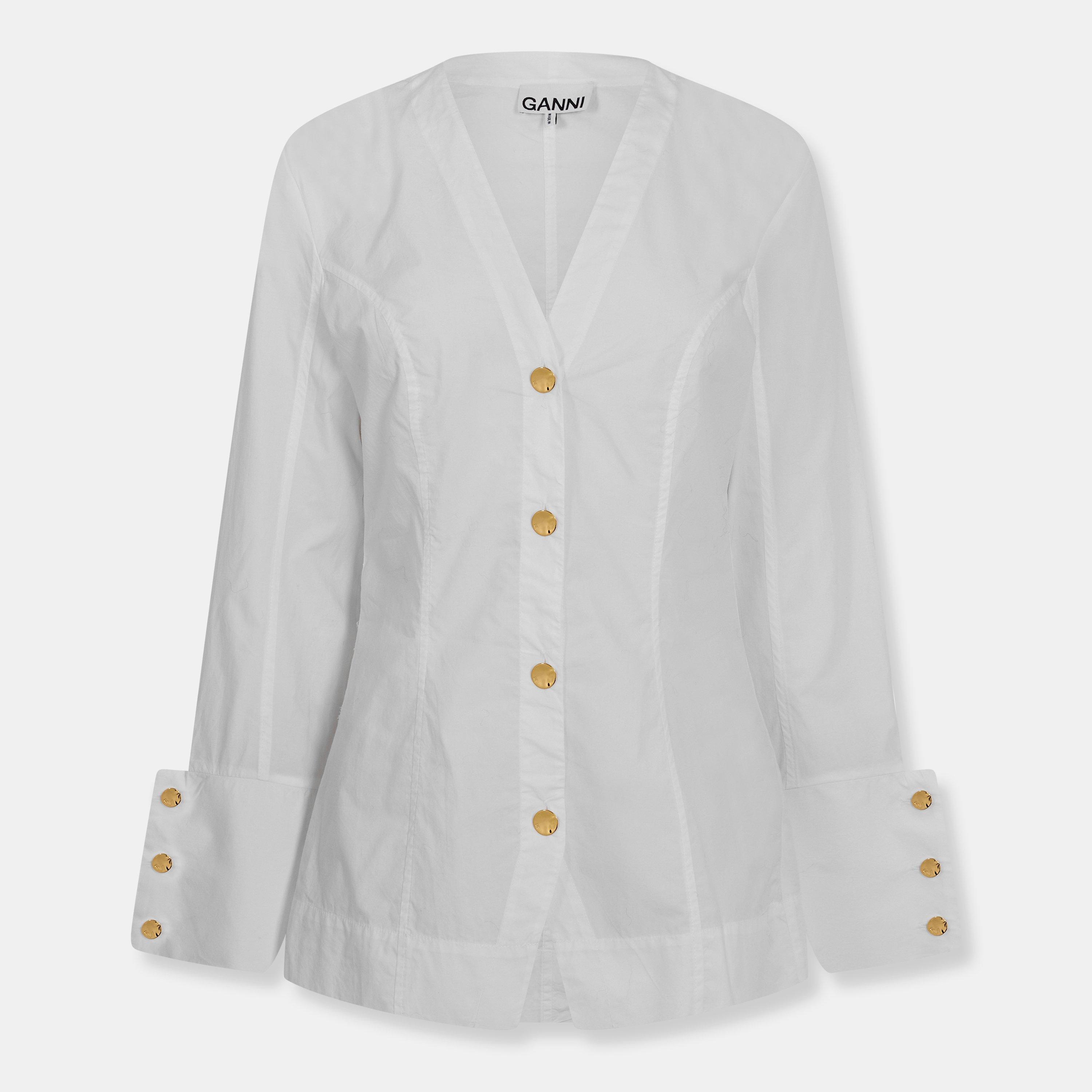 The Ganni Poplin V-Neck Shirt offers a clean, tailored cut with a flattering V-neckline. Designed with long sleeves and smooth poplin fabric, this shirt transitions across seasons.