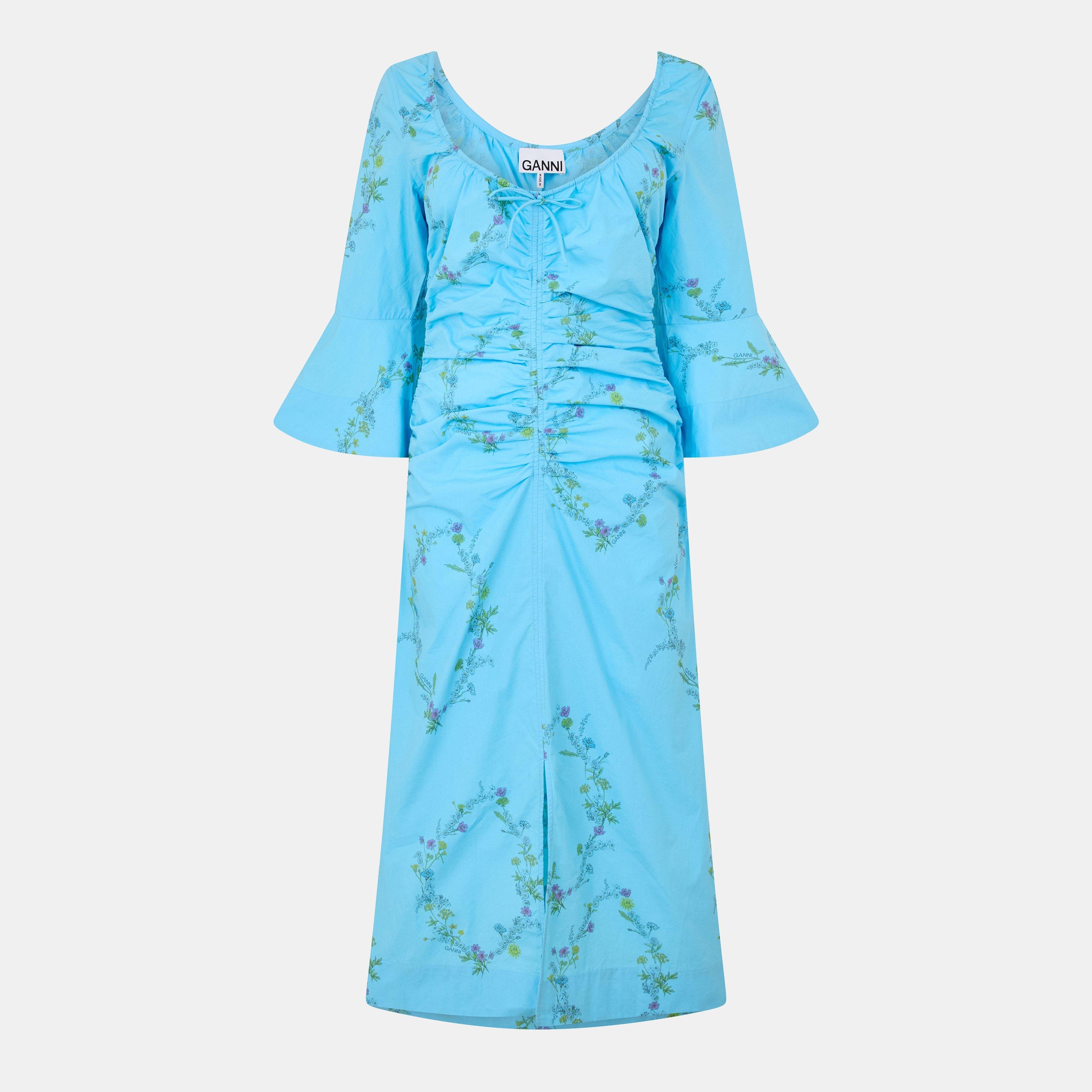 Ganni Smock Dress features a gathered shape with a flattering U-neck design that creates a feminine profile. The relaxed smock style offers comfortable movement with a contemporary edge characteristic of Ganni's aesthetic, ideal for casual wear.