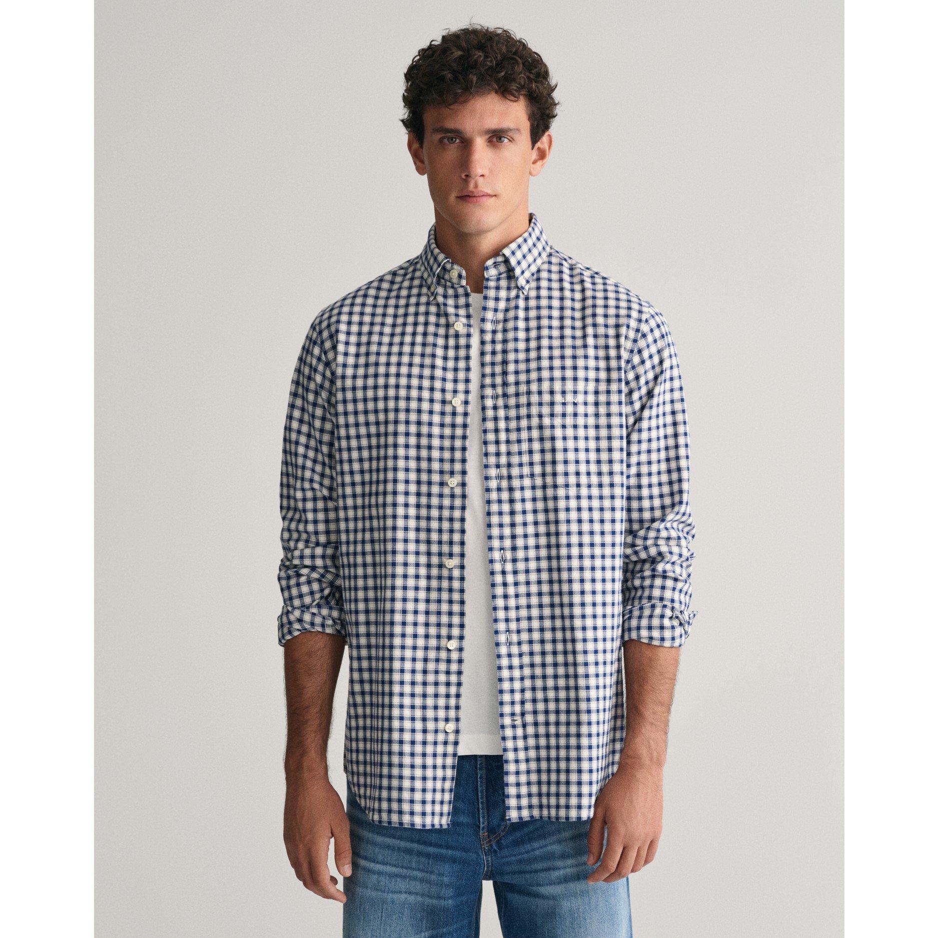 Crafted with a vintage-inspired cotton fabric, this GANT shirt offers a regular fit with a rustic and heavy-weight feel. The yarn-dyed checked pattern adds a timeless touch to the design, which includes a classic button-down collar, adjustable cuffs, and a curved hem. This shirt is complete with a GANT logo embroidered on the chest pocket, recycled polyester buttons, and a box pleat featuring the signature GANT locker loop invention at the back.