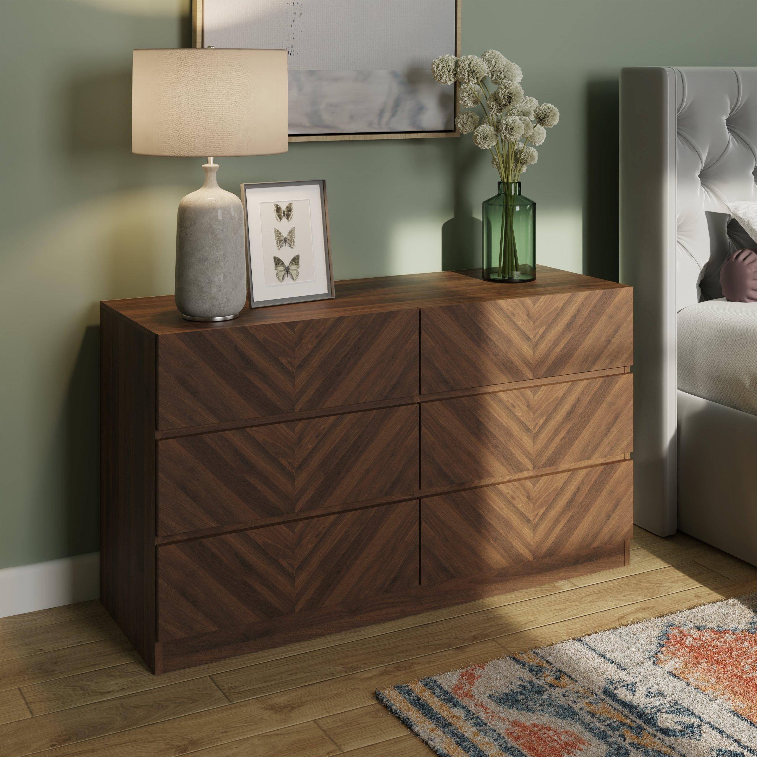 Delivering both style and practicality, this spacious 6 drawer chest features Herringbone inspired wood- grain design drawer fronts which make a true statement in any room setting. The handle free drawer systems open smoothly on the metal runners providing plenty of storage configurations, the Catania Chest can easily fit into your interior and provide the space you need for clothes and more. It's a style so classic that it would work as well in a city flat as it would in a cosy cottage. Available in both a Walnut & Oak colourway.