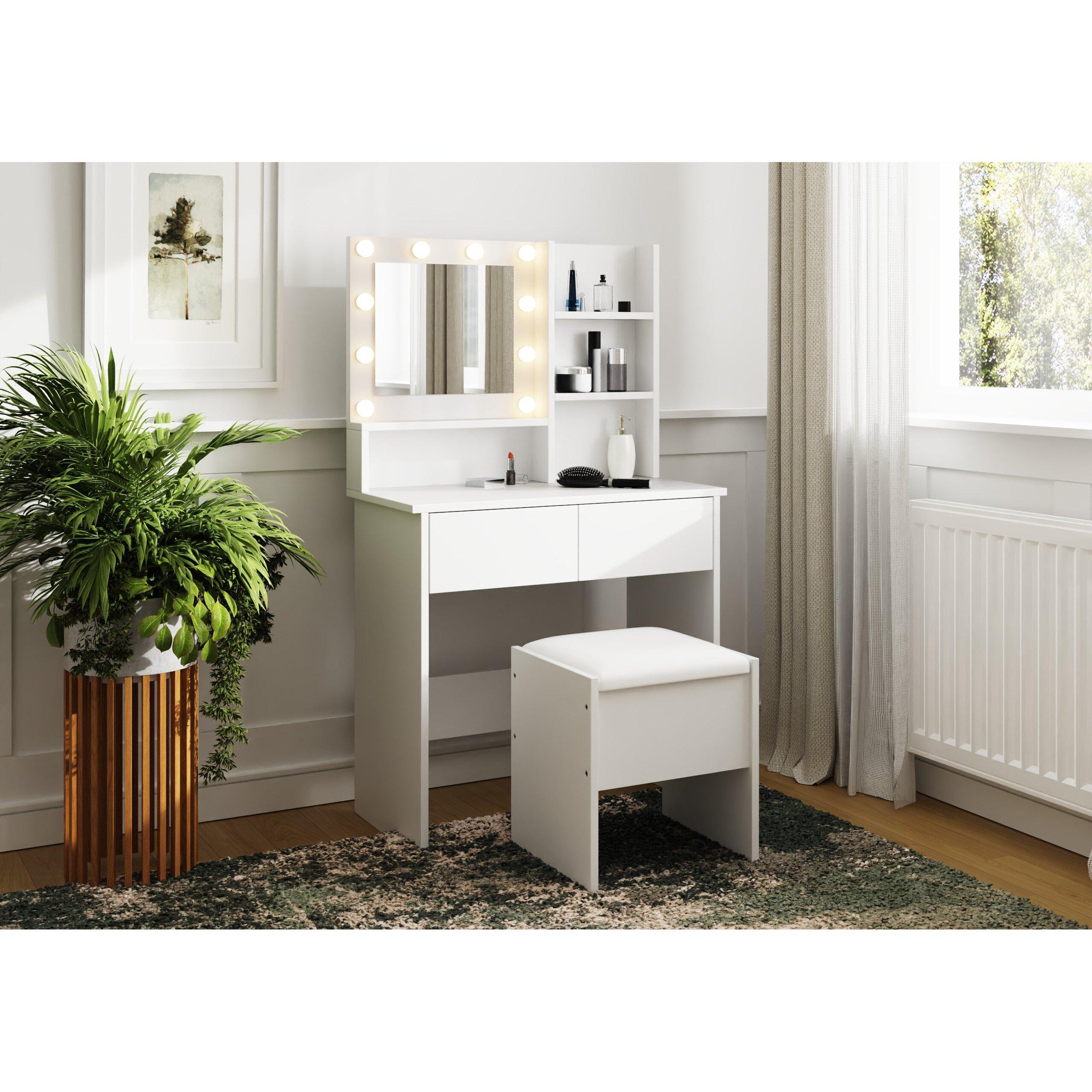 With ample storage for organizing beauty essentials, this table blends style and practicality effortlessly. The included upholstered cushioned stool adds a layer of comfort, providing both style and convenience to complete the set.