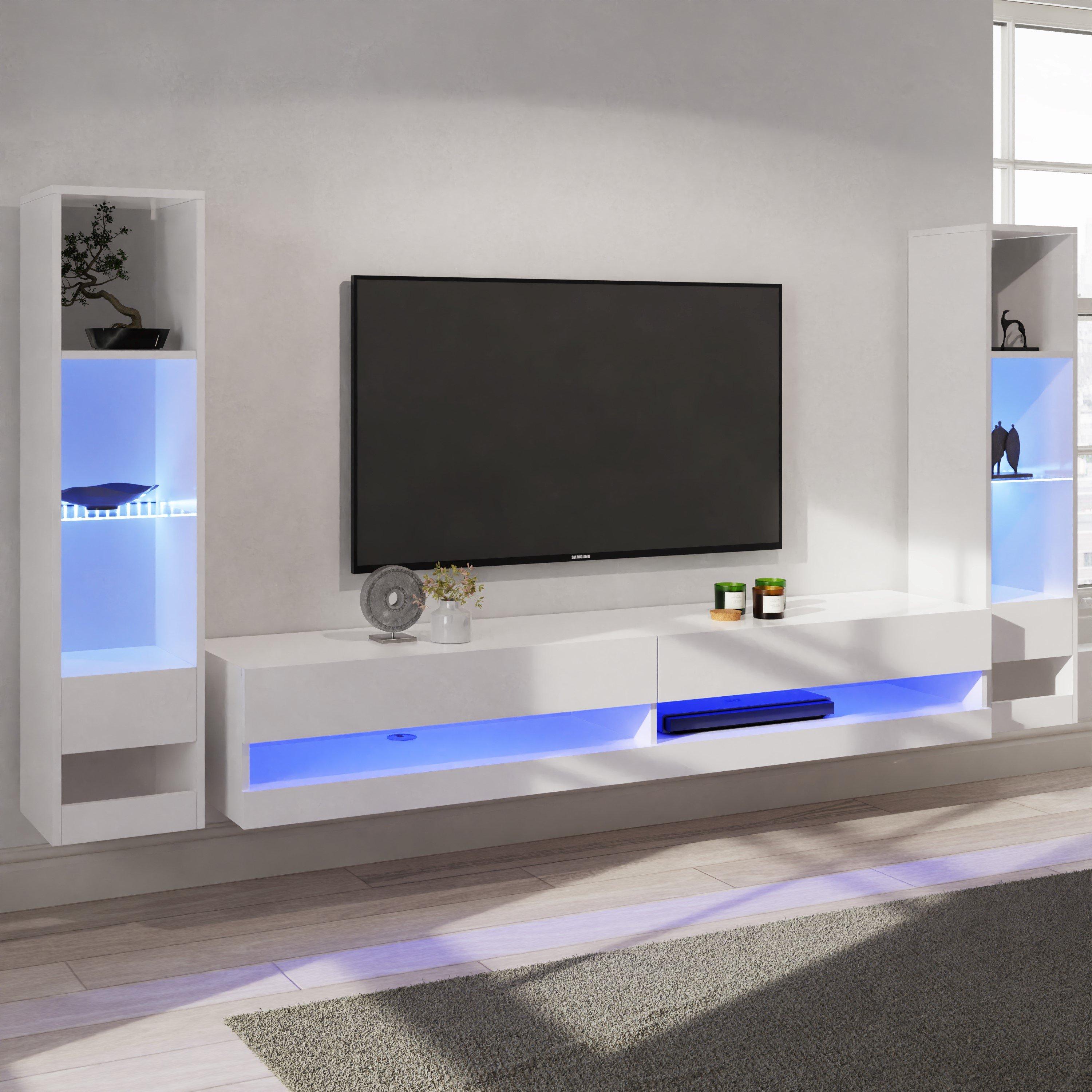 Gather all your essential AV equipment into a stylish wall-mounted storage unit with streamlined Galicia. The perfect companion piece for a flat screen TV, this simple twin-compartment furnishing piece exudes minimalist style. Theres space on top for a few well-chosen accessories, while underneath, LED downlight accentuates the open slot design feature.