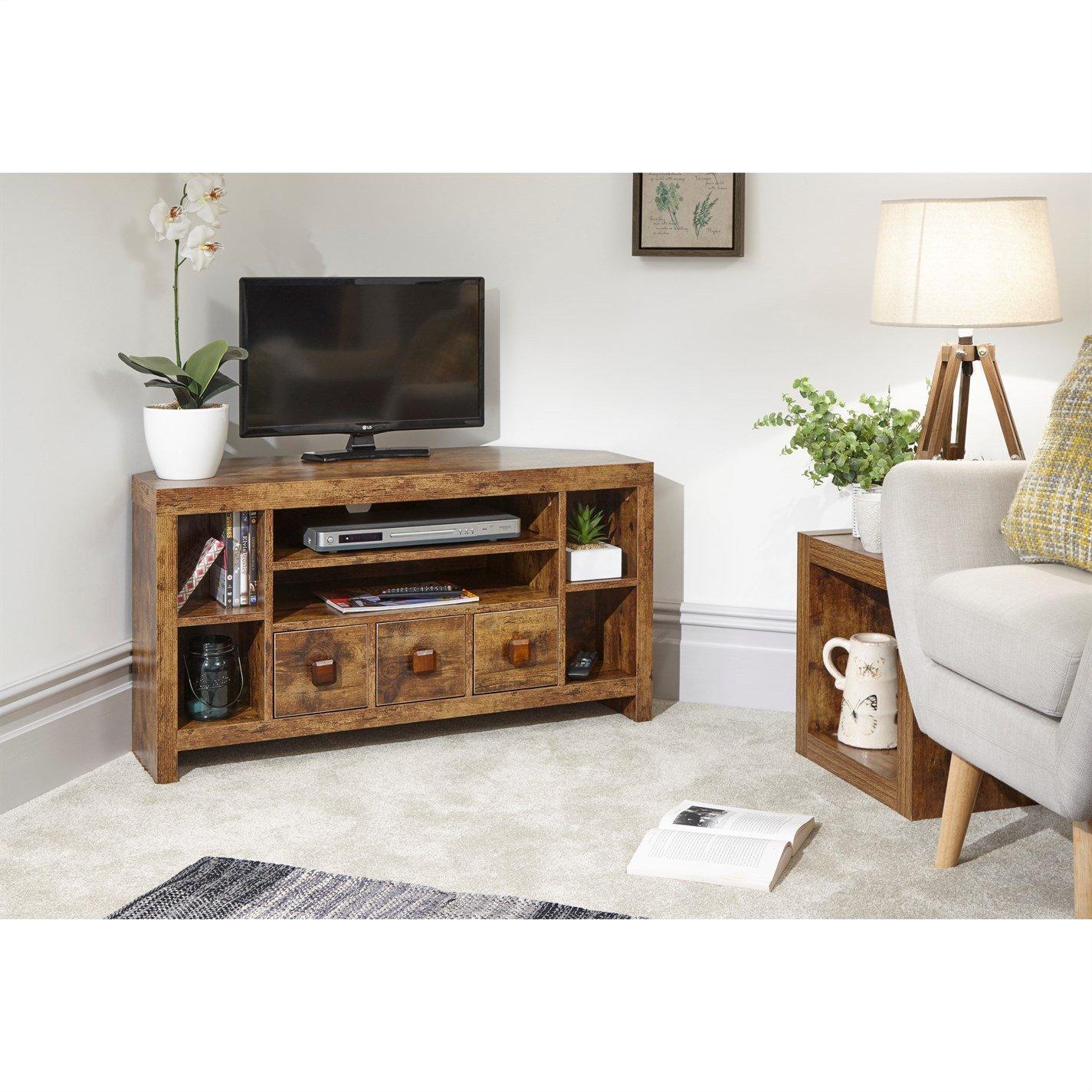 Where space is at a premium, furniture that fits neatly into the corner of a room is a smart choice and if it helps keep ugly cables tucked away out of sight, all the better. This handsome corner TV unit can house a completely self-contained entertainment centre. The Indian-inspired hardwood-effect finish gives it warmth and character, while the carefully designed arrangement of shelves and drawers can accommodate ample tech and media.